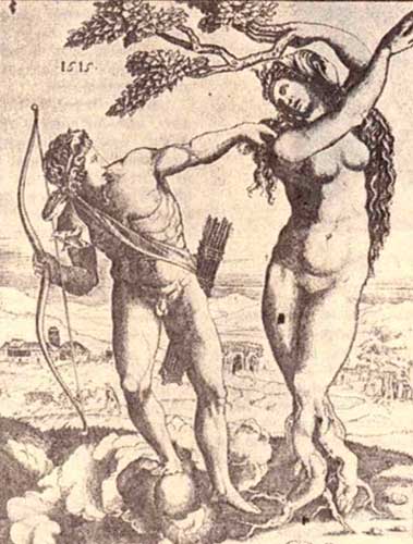 "История любви Аполлона и Дафны рассказана Овидием. Дафна дала слово сохранить целомудрие и остаться безбрачной, подобно богине Артемиде. Аполлон же, домогавшийся любви прекрасной нимфы, вызвал у нее ужас. Словно бы она увидела в нем сквозь ослепляющую красоту свирепость волка. Но в душе бога, разгоряченного отказом, все более и более разгоралось чувство. - Что же ты бежишь от меня, нимфа? - кричал он, пытаясь ее догнать. - Не разбойник я! Не дикий пастух! Я - Аполлон, сын Зевса! Остановись! Дафна продолжала бежать что было сил. Все ближе погоня, девушка уже ощущает за спиной жаркое дыхание Аполлона. Не уйти! И она взмолилась отцу Пенею о помощи: - Отец! Помоги дочери! Спрячь меня или измени мой облик, чтобы меня не коснулся этот зверь! Едва прозвучали эти слова, как Дафна почувствовала, что ноги ее деревенеют и уходят в землю по лодыжки. Складки влажной от пота одежды превращаются в кору, руки вытягиваются в ветви: боги превратили Дафну в лавровое дерево. Тщетно обнимал Аполлон прекрасный лавр, от горя сделал он отныне его своим излюбленным и священным растением..." Дафна - мифологический образ ветвистого мышления, которое "догоняет" речь. Лист лавра - мифологический образ истины. Полагаю, Рене Магритт к раздумьям о несоизмеримости добавил лист именно лавра. (см. картину в записи № 720) А это изображение Аг. Венециано "Аполлон и Дафна" из http://renesans.ru/anthology/06.shtml я бы назвала "Сказ поймал мысль" По всей видимости, образ Дафны пригодится при выявлении смысла, следующего за эоном "Высказывание", то есть смысла, обозначенного буквой "М" - "Мыслите". Посмотрела образ Дафны в искусстве - Живопись и скульптура Поллайоло Аполлон и Дафна (1470-1480) Бернини Аполлон и Дафна (1623) Рубенс Аполлон и Дафна (1636) Пуссен Аполлон, влюбленный в Дафну (1660-1665) Тьеполо Аполлон и Дафна (1743-1744) Уотерхаус Аполлон и Дафна (1908) Рене Синтенис Дафна (1918), (1930) Особого внимания заслуживает художественное чутье мысли у Джона Уильяма Уотерхауса http://about-artart.livejournal.com/401182.html