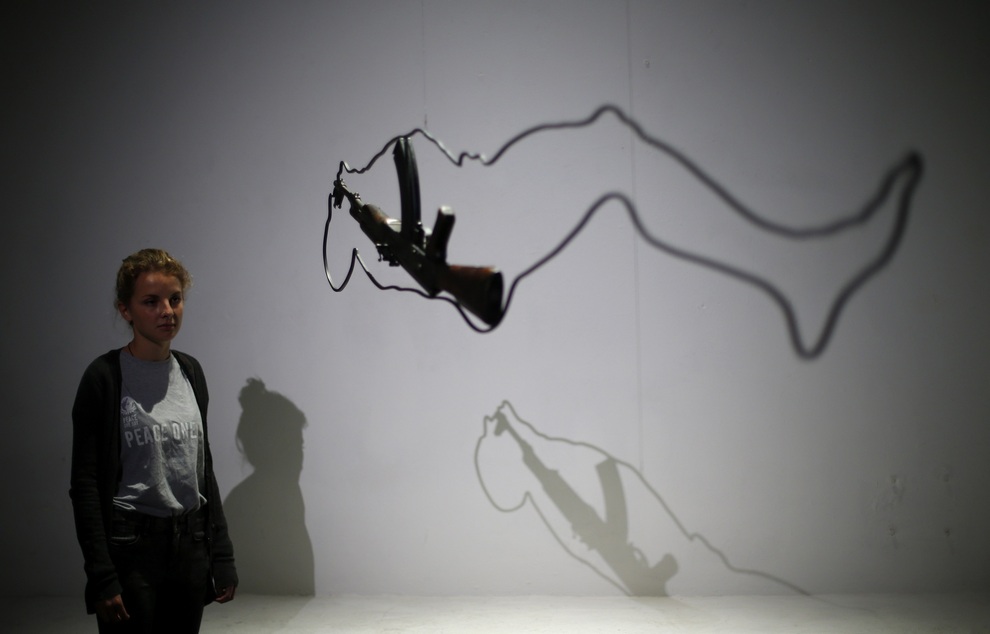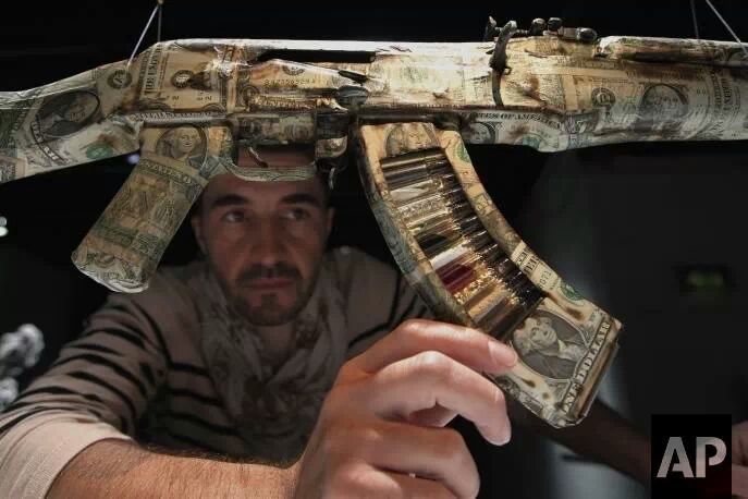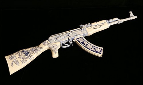 1. Итальянский дизайнер Никола Болла представил в Милане инсталляцию под названием «Склеп». Автомат Калашникова АК-47, инкрустированный кристаллами Swarovski, стал настоящей изюминкой выставки. 2.Коллекционер костей продает автомат Калашникова, сделанный из черепов, позвонков и ребер 3. АК из Дельфтского фарфора 4. Золотой АК 5-9. Автомат Калашникова как символ мира 10. На благотворительном аукционе в Лондоне был продан автомат Калашникова Дэмиена Херста за 55 тысяч фунтов В Институте современного искусства в Лондоне в 2012 г. была уникальная экспозиция под названием AKA peace, автором которой стал художник Бран Симондзон (Bran Symondson). Выставка посвящена самому популярному оружию двадцатого века автомату Калашникова. Несмотря на то, что «Калашников» находится на вооружении у более чем ста стран, главная идея выставки – стремление к миру, разоружение, поиск мирных вариантов решения конфликтов. Для этого создатель выставки отобрал работы 23-х популярных современных художников, посвященных АК-47. Бран Симондзон рассказал, что идея этой выставки родилась у него во время журналистского визита в Афганистан, когда он увидел местного бойца, чей «Калашников» был украшен изображениями роз, белых лент и прочими вполне мирными элементами.