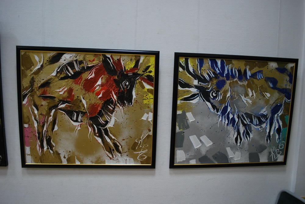 Вернисаж был многолюден. Пришли друзья, коллекционеры, галеристы. Рад был видеть и наших форумчан. Поздравляли люди из Минкульта, из Ферапонтово (там, где Казаринский мост), коллекционеры. Если выбирать три наиболее понравившиеся вещи, то это без сомнения золотой бык, большая красная птица в центральном зале и слева от нее – «Рождение формулы». Последняя – совсем особая, даже не сказать сходу, что казаринская. Но видно, что все три вышли из горнила ярчайшего внутреннего огня.