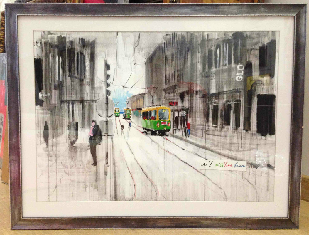 Марина Федорова, Don't miss your tram, 50 х 70 см., рифленый картон/акварель/акрил Марина Владимировна Федорова (р. 1981, г. Ленинград) 1996-2000 - СПб ХУ им. Н.К.Рериха, С-Петербург, Россия 2000-2006 - СпбХПА им. Барона Штиглица (Мухиной), С-Петербург, Россия Живет и работает Санкт-Петербурге. Выставки с 2001, в С-Петербурге, Москве, Париже, Генуи, Малаге, Хельсинки. Участник Арт-Москвы, Арт-Парижа, Арт-Болоньи, Арт-Вильнюса и Арт-Киева. Художник года шампанского "Nicolas Feuillatte" в 2008. Оформление фестиваля Мариинского театра в 2008. Участник "Благотворительного гала-аукциона при поддержке CHRISTIE'S" в Русском музее. 2012 -представлена галереей Lazarev gallery на ярмарке Art Moscow , Моcква -представлена галереей Kadieff gallery на ярмарке Art Helsinki, Хельсинки -участие в выставке "Еники Беники ели вареники" в Lazarev gallery, С-Пб -«Сейчас или никогда» галерея Ten 43, Нью-Йорк -представлена галереей Lazarev gallery на ярмарке Art Monaco, Монако -«Неслучайные связи» Lazarev gallery, С-Пб -представлена галереей ArtCurators на ярмарке JustMad, Мадрид