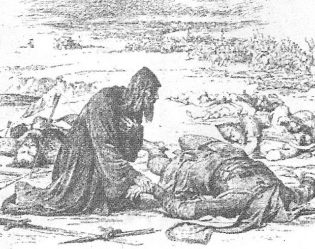 Важнейшие понятия справедливости и законности отразились в сказах народов мира в виде повествований о богатыре/герое, сражающемся с чудовищем и побеждающем его физически и духовно. В Древнем Египте это великий ГОР - сын Озириса. Философия Древней Греции считала носителем понятий права богиню Земли Гею и присоединила к ней ее голос/ор для наречения молодца именем ГЕОРГИЙ. Забегая немного вперед, скажу, что кодом принципа мудрости была буква "Э", которой славяне, почитая Гора очень умным, постарались короновать его имя, но получился ЕГОР. Именно этот смысл укоренился в слове "объегорить". Легенла о справедливом юноше Георгии-Победоносце прижилась на Руси, и за то, что в День великомученика Георгия крепостным крестьянам "справедливо" разрешалось переходить от злого хозяина к другому помещику, в народе этот день назвали «Юрьев день». В легенде справедливость олицетворена умным красивым юношей на белом коне. Озерный змий пожирал людей без разбору, и чтобы утолить голод змия, ему отдавали на съедение юношу или девушку по жребию. Когда жребий пал на дочь правителя, светлый всадник поразил зверя копьем и спас девушку. А заодно и жителей. Церковь воспользовалась этой легендой и судьбой исторической личности Георгия для создания образа св.Юрия. (Когда в 303 году воспитанный в христианской вере Георгий узнал о приговоре об истреблении христиан, он из сострадания отпустил своих рабов, а императора Диоклетиана обвинил в жестокой несправедливости и открыто объявил себя христианином, за что его подвергли пыткам и отрубили голову) К тому же присовокупили исторический факт, что Юрием Всеволодовичем звали великого князя, обезглавленное тело которого нашли на поле сражения на реке Сить. Верещагин В. П. Епископ Кирилл находит обезглавленное тело великого князя Юрия на поле сражения на реке Сить Возможно, это рисунок из альбома профессора В.П.Верещагина «История Государства Российского в изображениях Державных его Правителей», изданного в 1890 году в Санкт-Петербурге. Вот предисловие самого профессора исторической живописи Императорской академии художеств к этому изданию: «Издавая «Историю Государства Российского в изображениях Державных его Правителей» в виде альбома, считаю нужным пояснить, что, приступая к выбору и составлению этих рисунков, я не задавался целью захватить и картинно изобразить все замечательные события более чем тысячелетней жизни России, а имел в виду и намеревался, изображая Державных Правителей в строгом хронологическом порядке, представить общую картину роста, развития и постепенного возвышения России. В этом смысле предлагаемые вниманию русского общества рисунки могут быть рассматриваемы как иллюстрированная хронология, которая может и заинтересовать изучением русской истории, и облегчить его, давая возможность следить за событиями отдельно, по каждому рисунку, в пределах известного времени, а с тем вместе способствуя сосредоточению внимания и скорейшему запоминанию события, при более отчетливом и ясном представлении о них. Оставаясь верным своей цели, я не находил ни возможным, ни нужным обходить рисунком какого-либо правителя вследствие кратковременности или незначительности его деятельности, я старался, строго держась исторических указаний, изобразить каждого Державного Правителя или в связи с одн