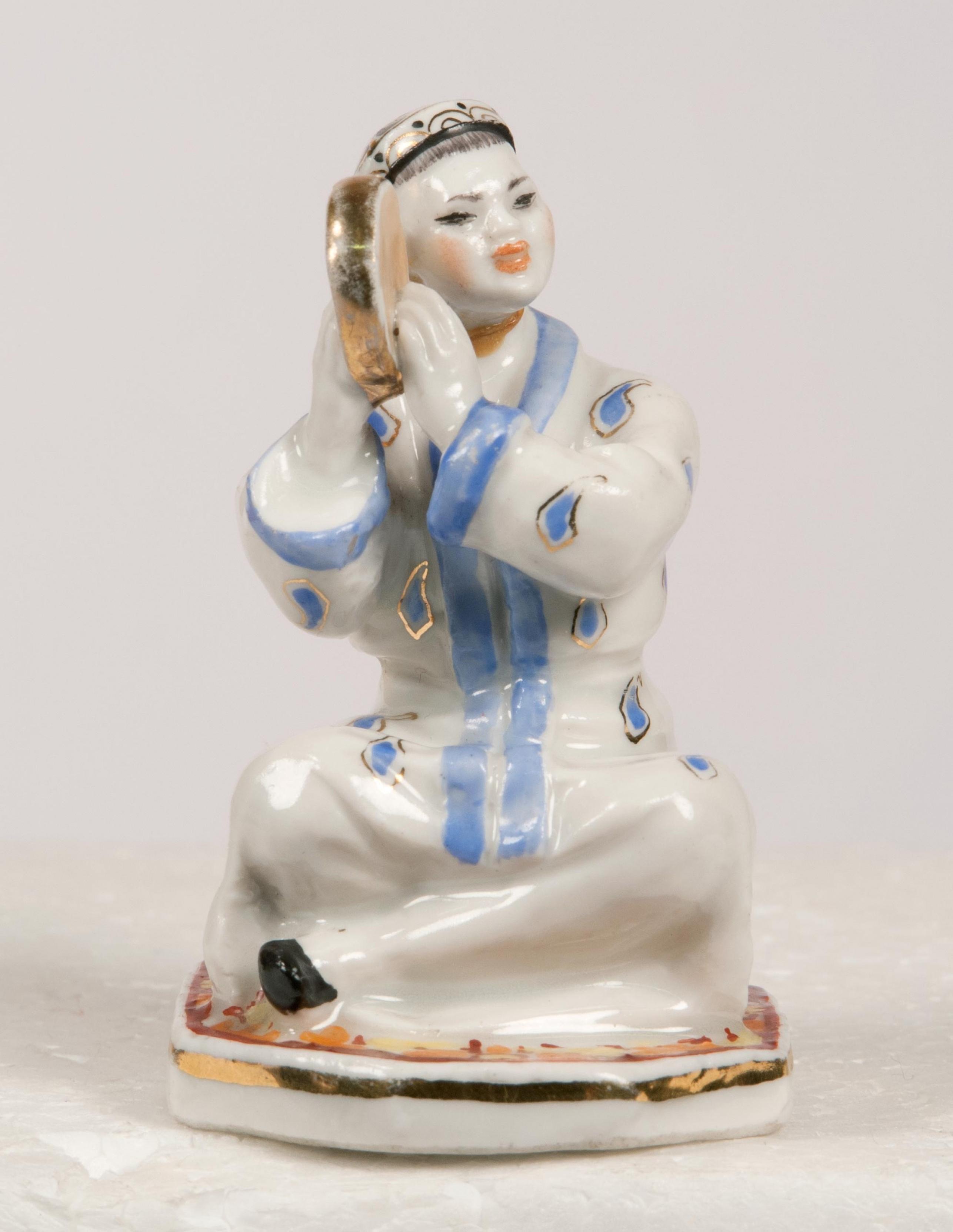 Фарфоровая фигурка «Узбек с бубном». Дулёвский фарфоровый завод, 1954 (?) Фарфор, надглазурная роспись. 6,8 × 4,4 × 4,6 Скульптор Чечулина Галина Дмитриевна (1926) Художник Шепелева Маргарита Михайловна (1926–1972) На донце синяя марка «ДЗ Дулёво» и надпись: ск-р Чечулина // Р-сь Шепелевой На донце стоит инвентарный номер 2500 руб. Резервная цена НЕ достигнута