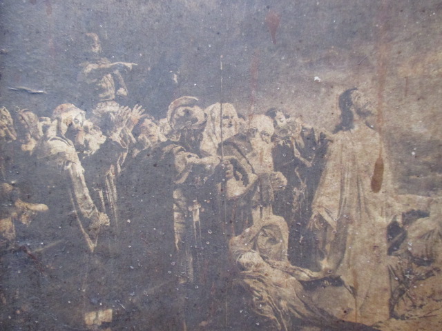 Возьмите пакет ваты и спирт, протирайте понемногу и потихоньку, пока не снимется вся грязь. Репродукцию можете сразу счистить с дощечки, чтобы не отвлекала. |