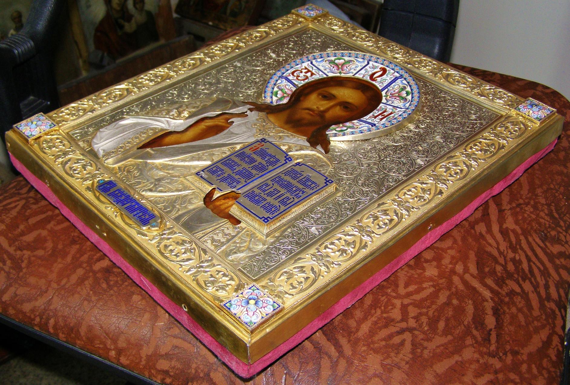 Начало 20 века. Алексеев Иван Алексеевич, владелец фабрики, основанной в 1876г., известной до 1912г., работы хранятся в ГИМе. Вес оклада 515гр. Полихромная живописная эмаль по скани (венец, угловые накладки), выемчатая эмаль (книга, надпись). Родная позолота. Клейма 84пр., И.А.А (именник). Проклеймены: оклад (проба, именник), венец (проба, именник), книга ("голова", именник), угловые накладки (именник). Всё родное. Без реставрации. Гарантия подлинности всех деталей оклада и живописи и отсутствия вмешательств.
