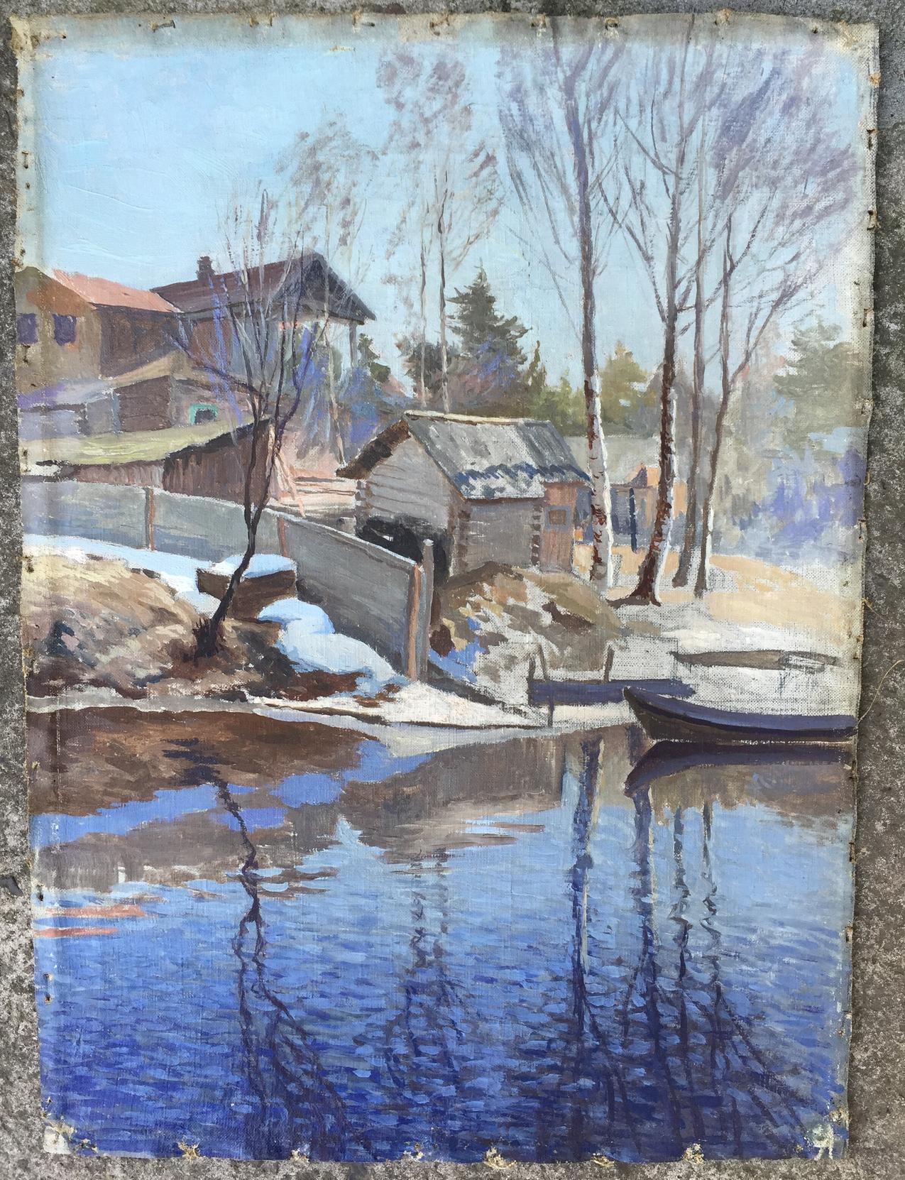 Снял с подрамника картину и немного добавилось еще формата,видно что с низу обрезано как минимум 3-4 см это видно по отражению деревьев которые явно обрезаны.Так же видно что с боков была обрезана,видны неровные края.Подпись была явно внизу.Вот еще работа которая пришла с Бирулей,тоже старая и тоже обрезана с двух сторон.Может по ней есть варианты авторства.подскажите пожалуйста!С ув.
