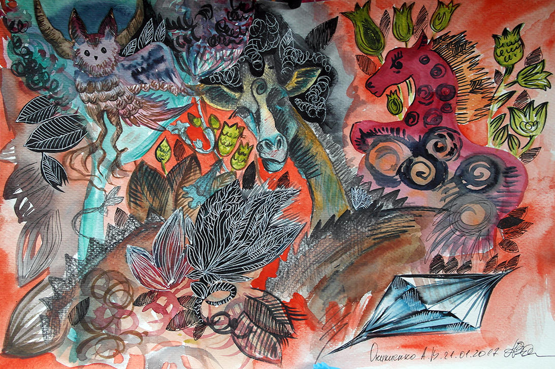 Акварель, маркеры, смешанная техника, бумага. 75х61 см |