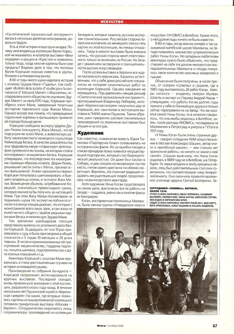 Часть 2 Нина Коган - родная сестра поручика Киже ”Авангардная лихорадка” порой принимает гротескные формы, доказывая, что охотники торговать ”мертвыми душами” не перевелись в России, да и за ее пределами. В середине 80-х в экспозициях музеев в Нью-Йорке, Франкфурте и Женеве вдруг появилось большое количество ранних работ Михаила Ларионова - выполненные пастелью и тушью абстрактные рисунки голов, пейзажи и виды Москвы. Легенда, сопровождавшая их, гласила: рисунки Ларионов оставил в Москве, когда в 1917 г. уезжал в Париж вместе со своей первой женой Натальей Гончаровой.