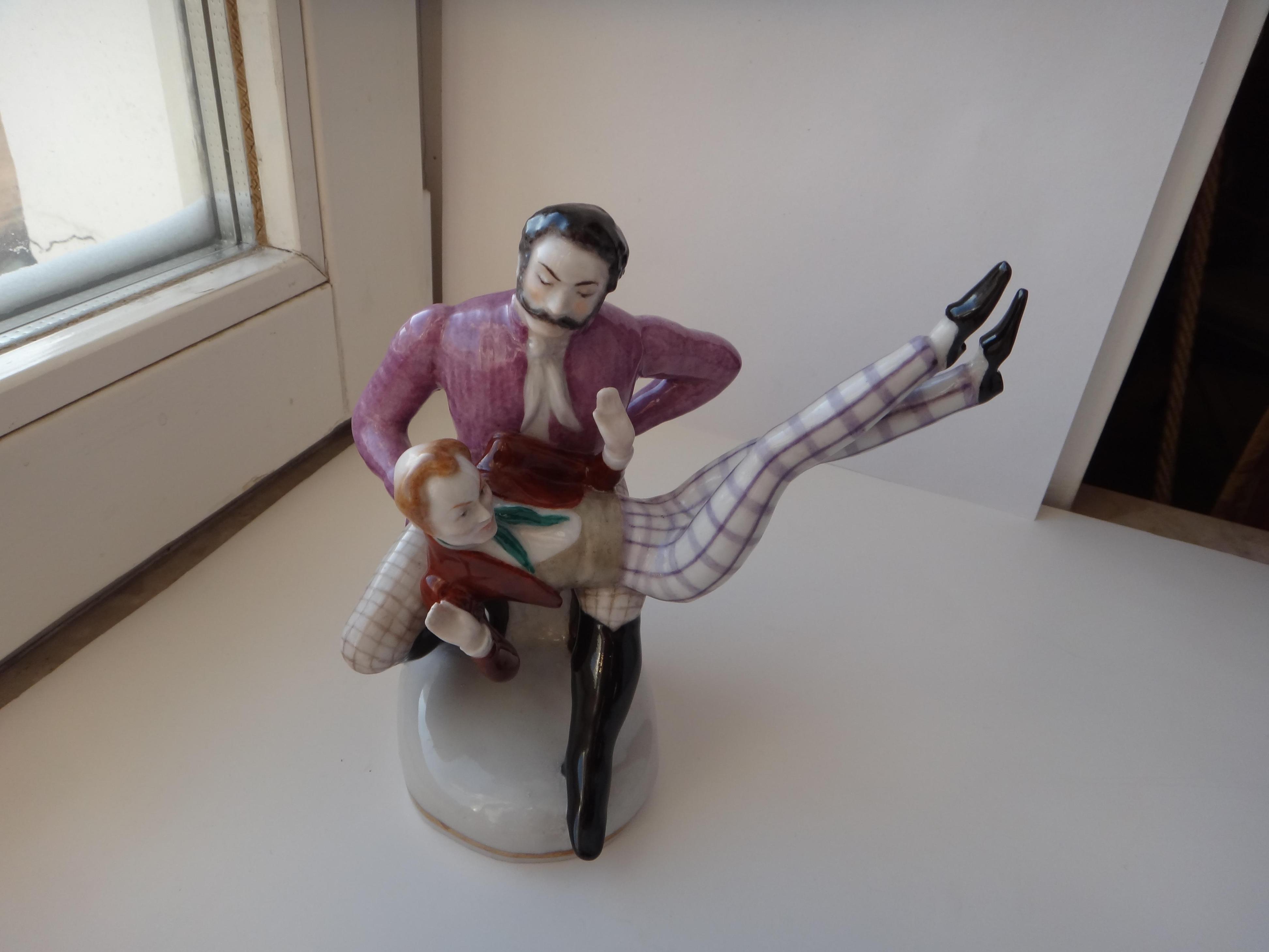 Авторская работа скульптора Дрокиной В.П. Фарфор. Высота 17 см. Изготовлена и расписана автором. 1980 год. Изображены артисты Ленинградского театра им. Кирова (Мариинский театр) - Сергей Лейферкус и Николай Майборода в опере "Мёртвые души" в роли Чичикова и Ноздрева.