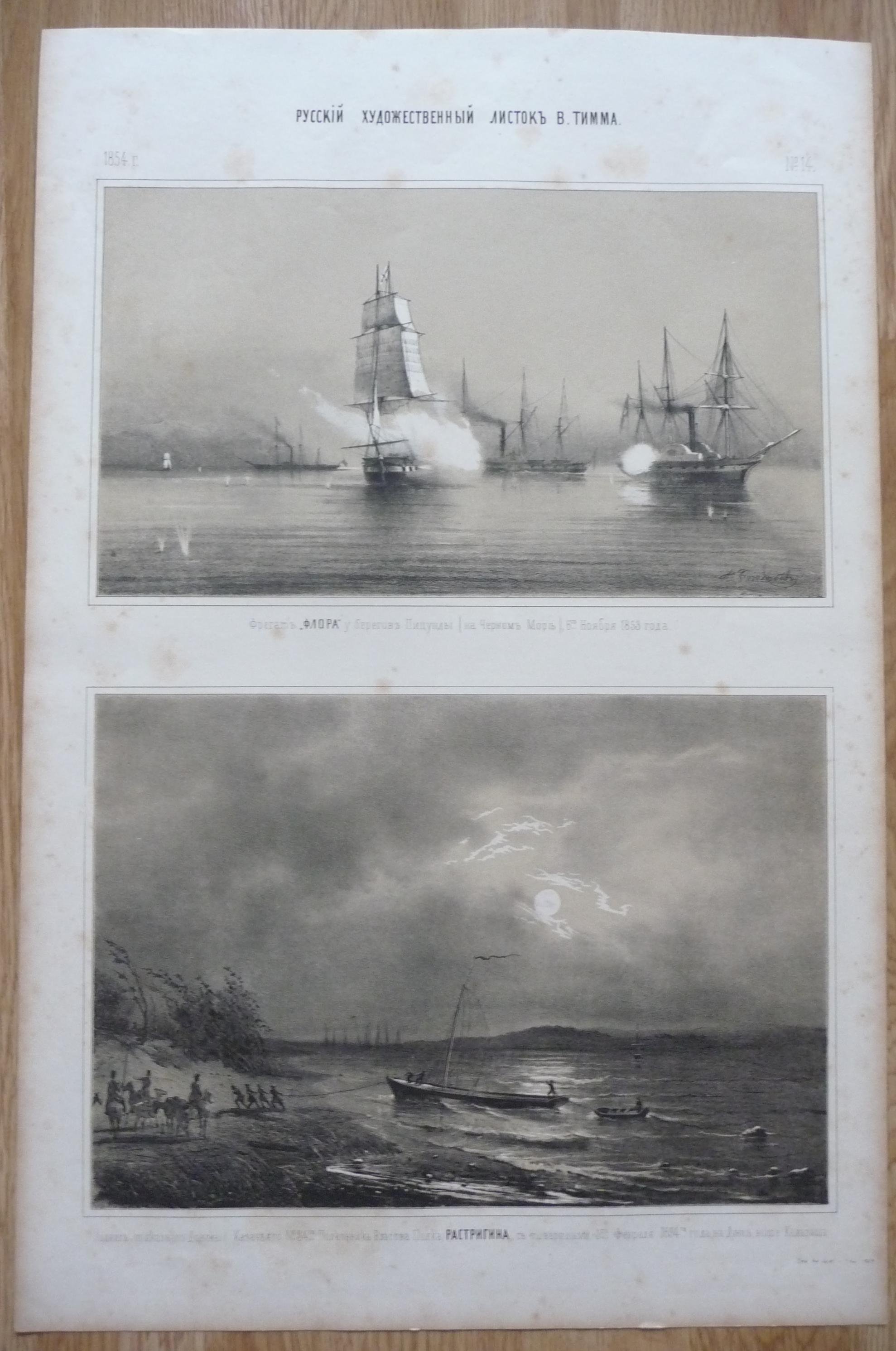 03 Истребление турецкой эскадры Адмирала Осман-Паши, при городе Синопе, эскадрою Черноморскаго Флота под командою Начальника 5й Флотской Дивизии, Вице-Адмирала Нахимова, 18 ноября 1853 года (3000 руб.) 06 Фрегат «Флора» у берегов Пицунды на Черном море 6-го ноября 1853 года; Подвиг приказного Донского Казачьего № 34 Полковника Власова Полка, Растригина, с товарищами, 5 февраля 1854 года, на Дунае, выше Калараша 4000 руб. 21 Генерал-лейтенант, князь Василий Осипович Бебутов, командующий действующим корпусом на турецкой границе...; генерал-адьютант, вице-адмирал Владимир Алексеевич Корнилов... ; генерал-лейтенант Александр Фёдорович Багговут... 4000 руб. 34 Контр-адмирал Владимир Иванович Истомин, генерал-майор Николай Дмитриевич Тимофеев 3000 руб. 41 Сестры Крестовоздвиженской общины попечения о раненых. Севастополь, 1855 год (с фотографии С. Левицкого) 4000 руб. |