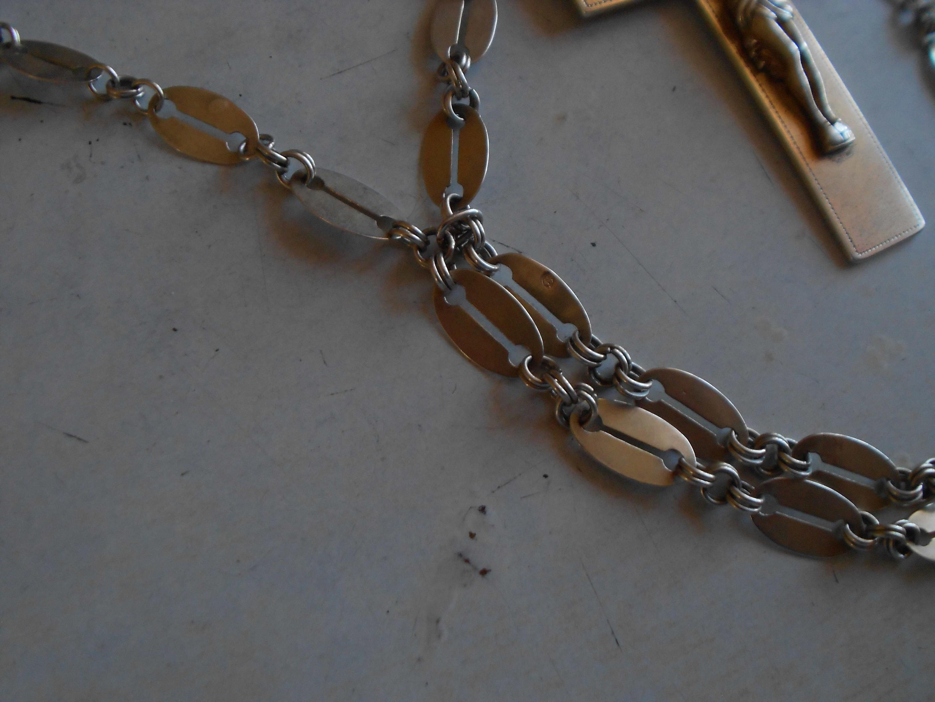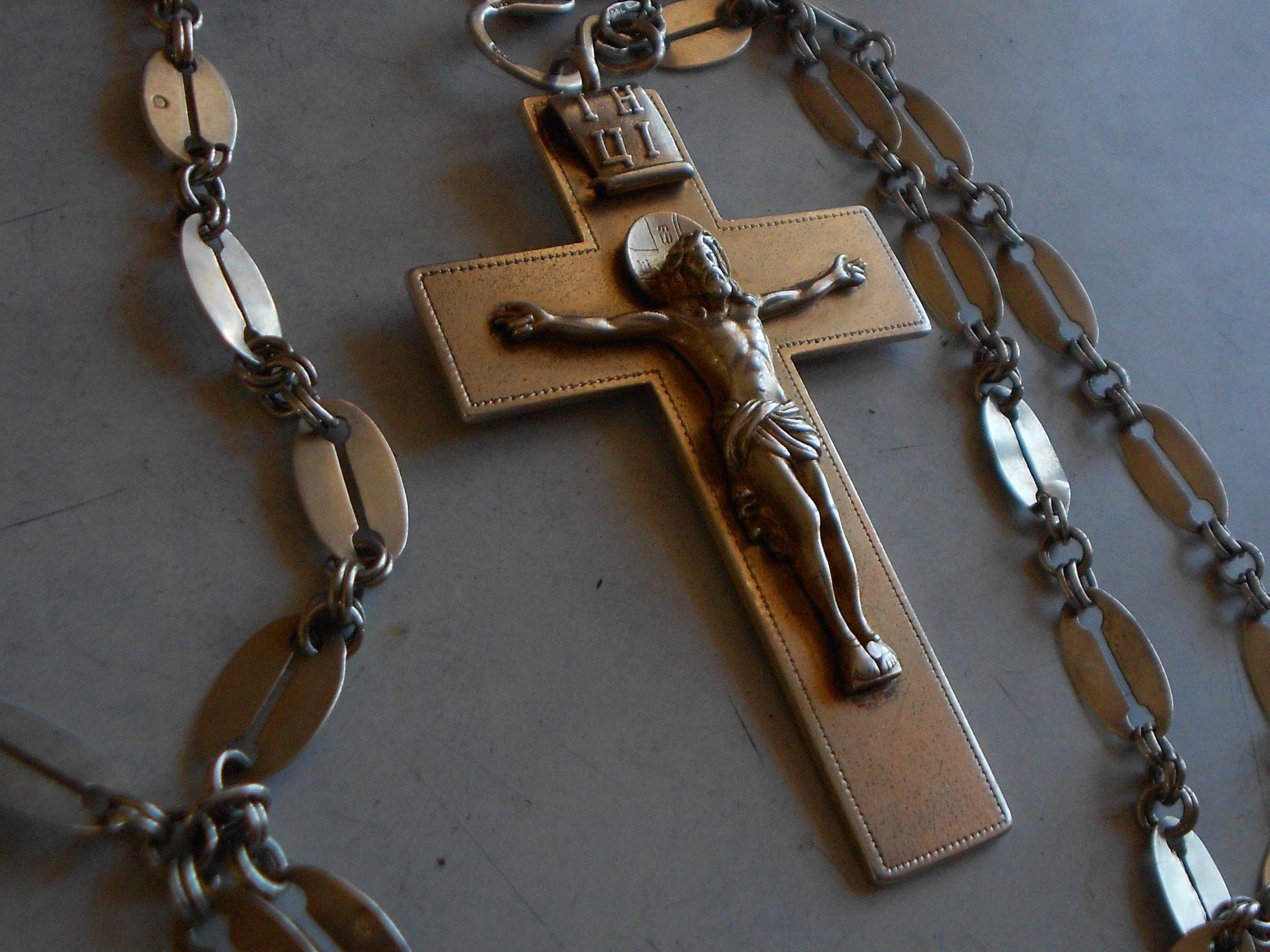 С накладным "титулусом" встречается редко , общая длина 76 см. длина цепи 64 см. длина цепи до кольца (перемычки) - 42 см. Размер Креста : 11,3*6,8 см. общий вес : 175,1 гр. вес Креста