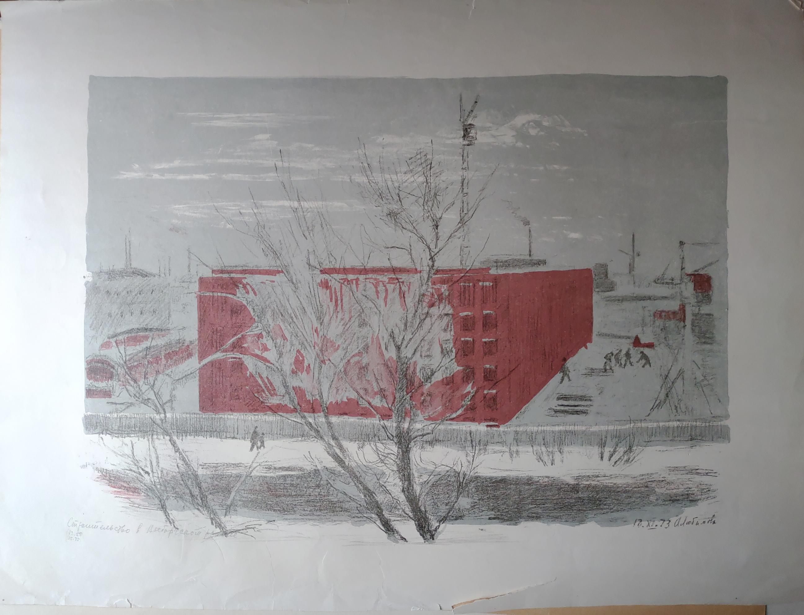 • "Точечные дома", 1972, автолитография, 55х75 см. • "Выход к заливу на о-ве Декабристов", 1966, автолитография, 55х72 см. • "Вечер в новом районе", 1967, автолитография, 72х50 см. • "Строительство в Выборгском районе", 1973, автолитография, 55х75 см. |