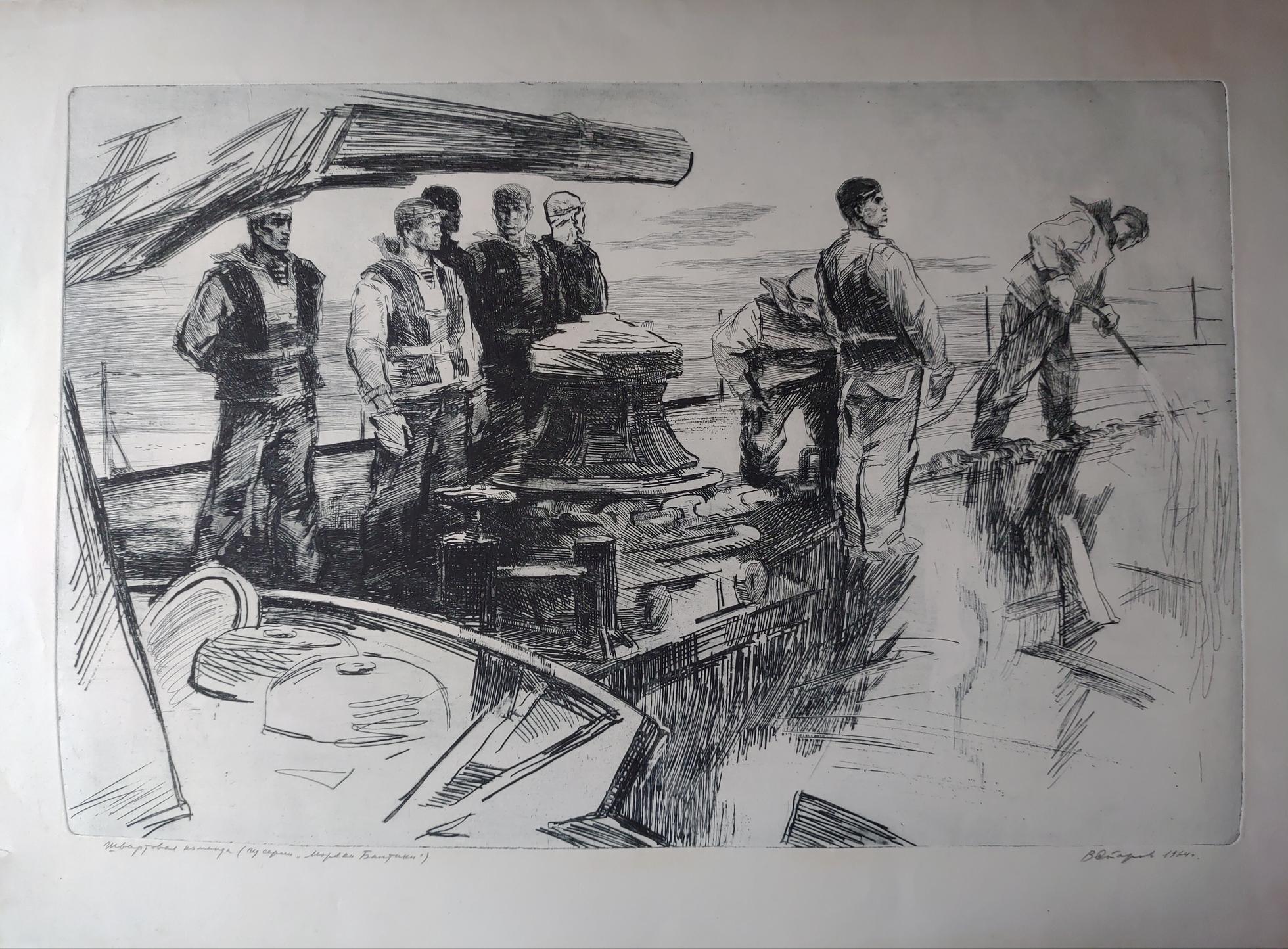 • "Швартовая команда" (из серии "Моряки Балтики"), 1964, офорт, 60х82,5 см. • "Из отпуска" (из серии "Моряки Балтики"), 1964, офорт, 58х76 см. |