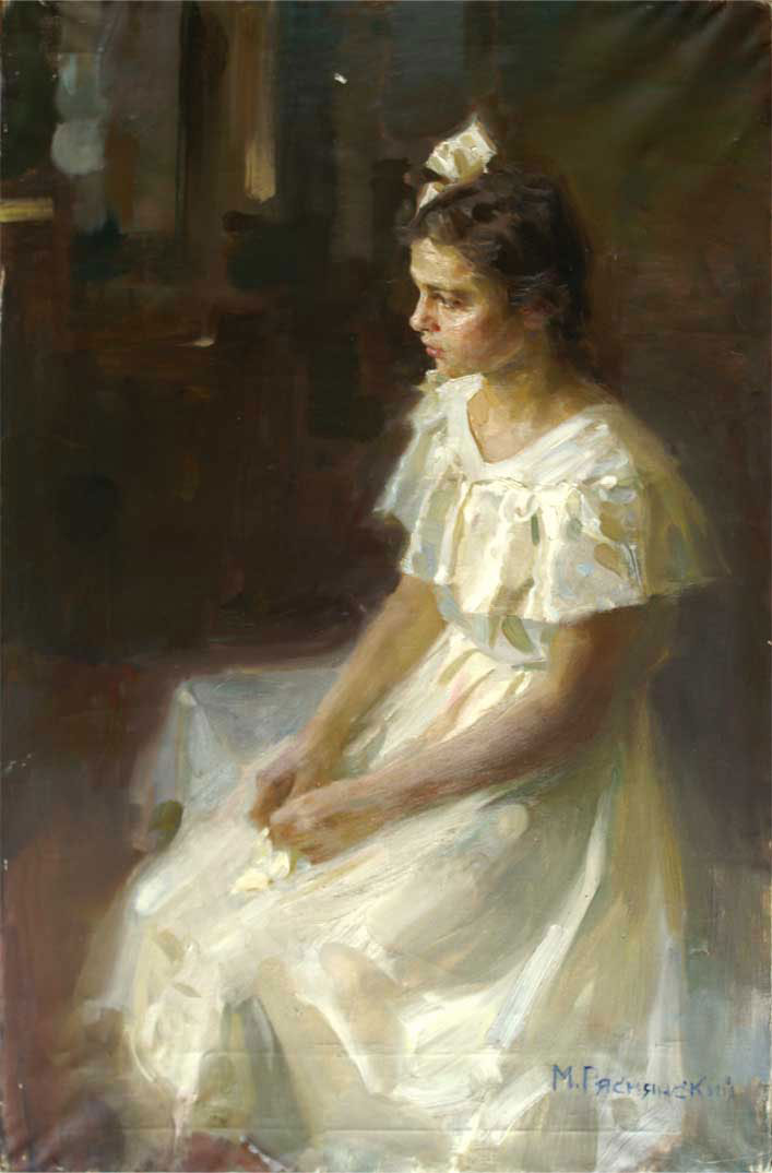 Полагаю, что это работа его первой жены Евгении Ряснянской. Лично с ней я не знакома. В начале 90-х видела ее акварельный портрет 50-х годов кисти отца в музее Киевского художественного института(к сожалению этот портет исчез из института, фотографию я сделать не успела). О Евгении Ряснянской я узнала из воспоминаний отца. Ниже привожу цитаты, где он упоминает свою первую жену: