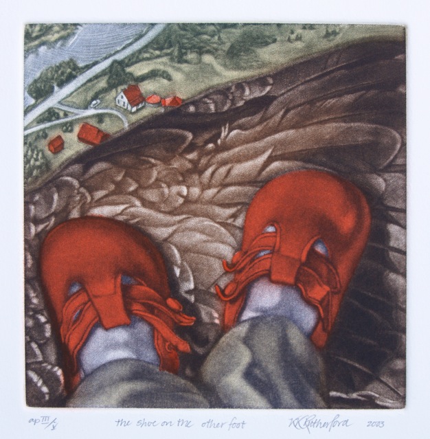Комментарий автора к работе. Это вид сверху на мой дом, мастерскую и небольшой участок береговой линии, ставший предметом долгой и нелепой судебной тяжбы, которая изменила наше отношение и к соседям и к месту нашего жительства. Мне захотелось сделать что-то более позитивное из всего этого опыта. Выражение shoe on the other foot (переменить ситуацию, взглянуть на нее по-другому, букв. «ботинок на другой ноге») намекает на мою попытку взглянуть на ситуацию с другой стороны (с высоты птичьего полета). Стоя на гусином крыле (подарок охотника) ребенок (в ботинках моей дочери, надетых на разные ноги) может увидеть все свежим взглядом. |