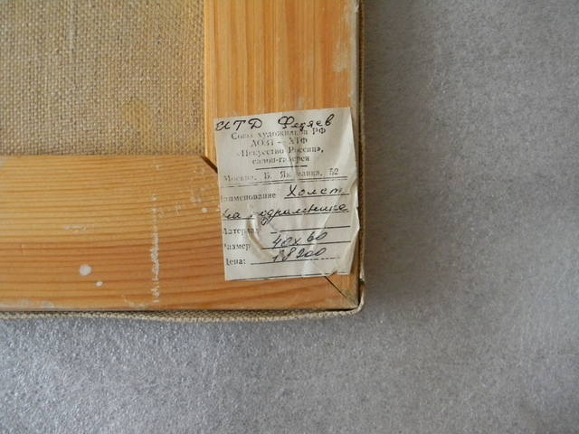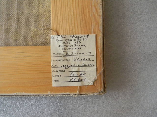 На обратной стороне картин, присутствует бирка с местом продажи: Москва, Б.Якиманка 52 (Салон галерея искусство Россия и инициалы художника - "ИТД Федяев". Гуглил, находил похожего, но думаю, что писали разные люди. Размеры так же указаны на бирках. В общем, буду благодарен любому мнению и ответу. ![]()