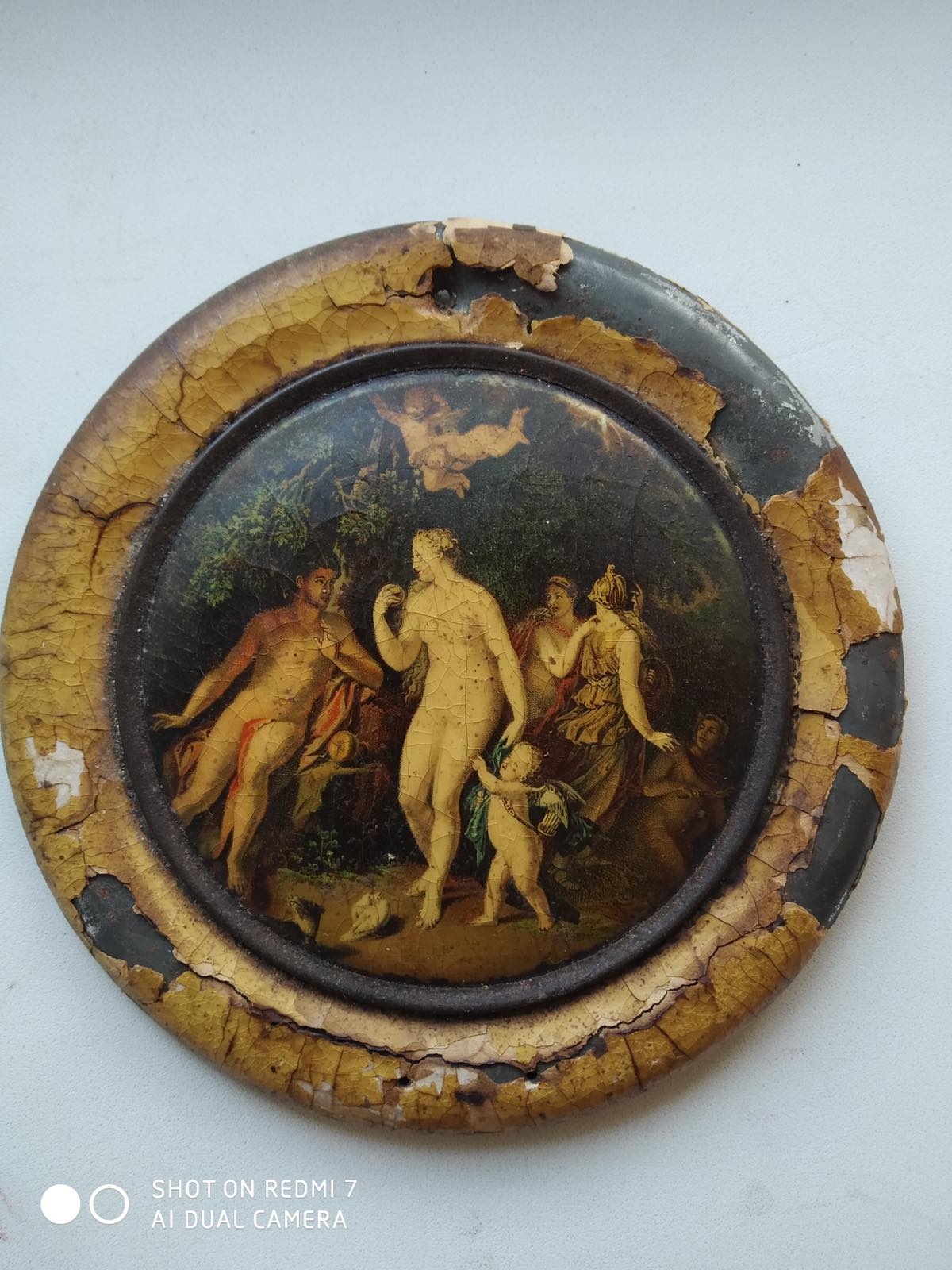 Если угодно точнее, хромолитография (там "в тенях" - растр, фото плохие) на плотной бумаге (иногда типа тонкого картона) с лаковым покрытием (он и потрескался). Чаще самый конец 19-нач. 20 вв, но учитывая основу этого предмета может быть и 1910-1920 гг. - в данном случае, это не существенно.