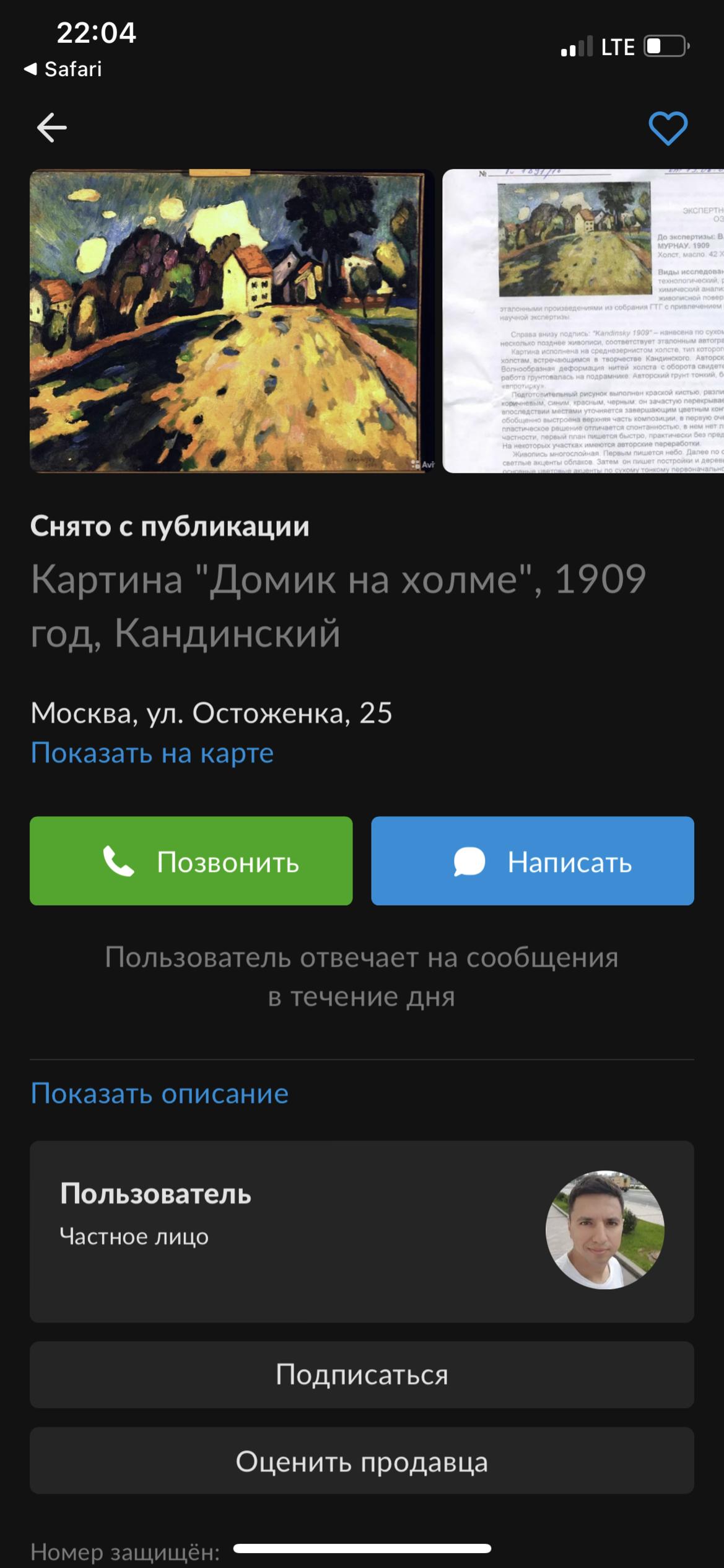 В ПОМОЩЬ ДОНБАССУ ПРОДАЁТСЯ КАРТИНА КАНДИНСКОГО С нами связались люди, которые давно поддерживают русский Донбасс. У них есть картина Василия Кандинского "Мурнау. Домик на холме", созданная в 1909 году. Подлинность работы подтверждена рядом экспертиз Государственной Третьяковской галереи, Росохранкультурой и другими учреждениями. По данным Коллегии экспертов и оценщиков при Торгово-промышленной палате РФ, оценочная стоимость картины начинается с €8 млн. Нам было предложено выставить картину на аукцион через криптовалютный проект "Террикон": https://www.terricon.org/art-for-victory На сайте сделано NFT-изображение картины. Начальная цена на аукционе будет составлять половину от реальной стоимости — €4 млн. Тот, кто приобретёт данный NFT, станет владельцем картины Кандинского. Произведение искусства будет доставлено владельцем в любую точку земного шара. Прибыль с продажи картины будет направлена на поддержку боевых подразделений и военной медицины ДНР. По всем вопросам пишите на terricon-project@protonmail.com ———————————— Несколько вопросов: 1. Зачем сделано и что значит в данном случае NFT-изображение? Ведь продаётся сама картина, не изображение этой картины. 2. Прибыль или вырученные средства? )) 3. В любую точку земного шара?! )) 4. Я не специалист, может кто-нибудь знает провенанс работы? Ну и, piece de resistance, скриншот с авито! )