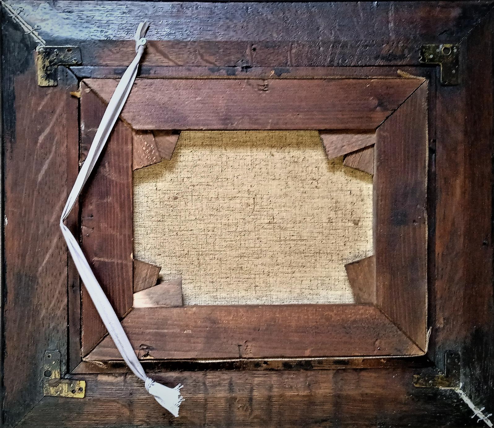 Вскрыл, инициал "О". Ещё обратил внимание, что холст местами скреплен медными скобами. В каких годах появились степлеры? Похоже, что рамка хоть и дубовая, но не родная.