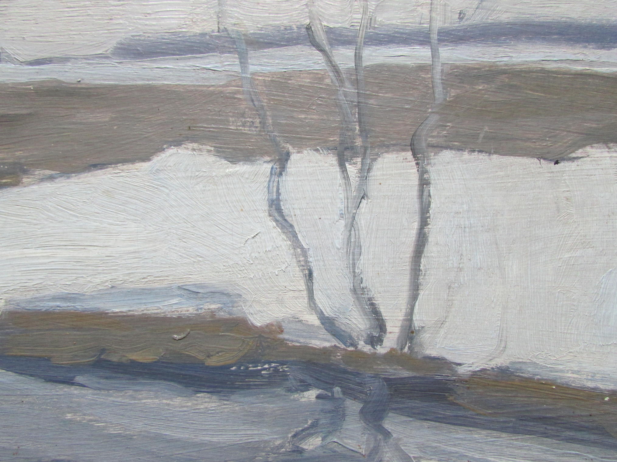 ИМХО: копия по открытке. 1. деревья слишком кривые 2. язык снега - грубо скопирован 3. под берегом - идёт черная полоса. Язык снега и его отражение создают этакую "перемычку". Копиист не смог выдержать пропорции и у него получались две "тёмные сосиски". :0) |