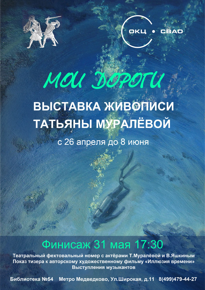Уникальная программа: презентация картин в стиле классический и мистический реализм, театральный фехтовальный номер, показ тизера к авторскому художественному игровому фильму "Иллюзия времени", выступления музыкантов. Художник, автор сценария фильма, режиссёр и актриса исполнит фехтовальный номер с актёром кино Вячеславом Яшкиным. Картины пополнят Вашу коллекцию, а театральный номер в исполнении артистов /бой на шпагах/ может стать украшением любого мероприятия. https://muraleva.ru/ Выставка проходит по адресу: м. Медведково, ул. Широкая д. 11. Из метро сразу направо, обойти следующее здание слева. Часы работы Библиотеки: вт.-сб. с 12.00 до 22.00, вс. с 12.00 до 20.00, пн.-выходной |