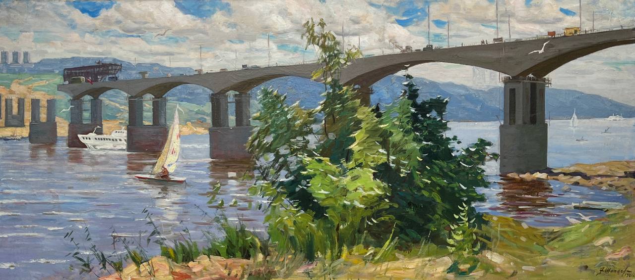 Строительство моста через реку Оку. В г. Горьком 1981 год 80 / 176 Заслуженный художник РСФСР 1970 г. Федор Васильевич Шапаев родился 16 апреля 1927 г. в селе Покой Саратовской области. В 1949 г. окончил Ивановское художественное училище, в 1955 г. – отделение станковой живописи Московского государственного художественного института им. В.И. Сурикова. Шапаев Ф.В. – член Союза художников России с 1960 г. Заслуженный художник Российской Федерации с 1970 г. Неоднократно избирался членом правления, членом президиума правления МООСХ, членом ревизионной комиссии МООСХ, секретарем, членом бюро творческой группы Дмитровской ХПМ, назначался членом художественных советов МООХФ, руководил изостудией. Участник многочисленных групповых всесоюзных, республиканских и зональных выставок. Персональные выставки:1967, 1972, 1977, 1987, 1997, 2005, 2012, 2017. Награждён орденом «Знак Почета» (1986), медалью «За доблестный труд» (1970), Дипломом I степени Министерства культуры РСФСР (1957). Работы находятся в Архангельском музее изобразительных искусств, Северо-Осетинском художественном музее им. Туганова (Орджоникидзе), музее-заповеднике «Дмитровский кремль», Серпуховском историко-художественном музее, в Воронежском музее изобразительных искусств, Андижанском музее (Узбекистан), Рыбинском историко-художественном музее, Переславль-Залесском историко-художественном музее, музее Приаргунского колхоза им. Лазо (Читинская область), приобретены Дирекцией художественных выставок Союза художников России, управлениями культуры Московской области и Тулы, а также в частных коллекциях в России, США, Великобритании, Исландии, Турции, Италии, Чехии, Словении, Югославии, Франции, Германии.
