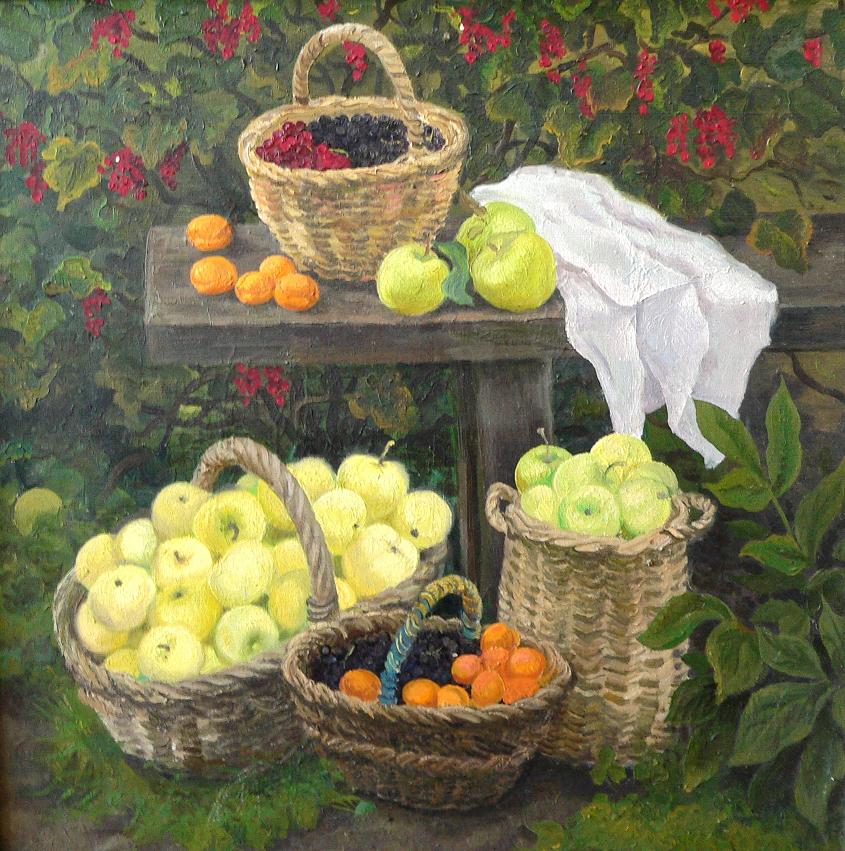 Корзина с яблоками - Оксана, уборка яблок - Ольга.