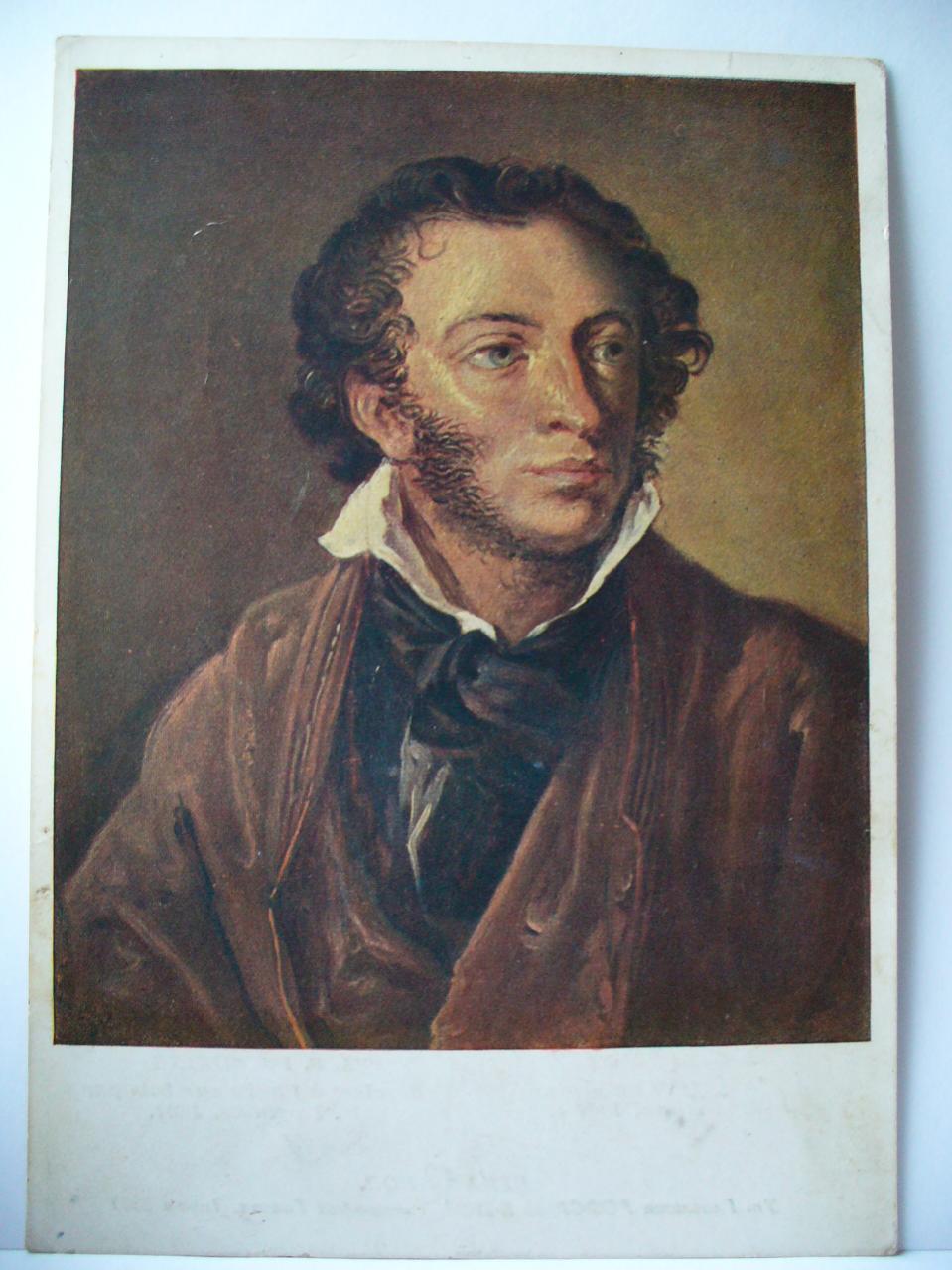 AS Pushkin, oil sketch on wood V. Tropinin, 1827 Storage Location - State Literary Museum. Postcard was published in 1937 |