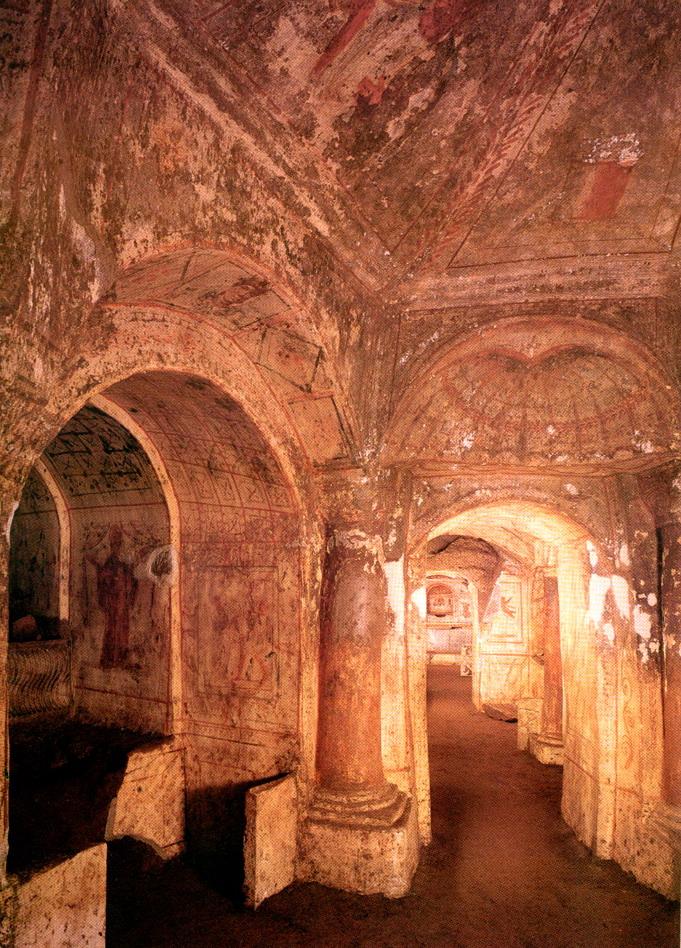 В катакомбы входили также гипогеумы — от латинского (лат. hypogeum) — помещения религиозного назначения, однако с точно не установленной функцией, а также зачастую небольшой зал для трапез, зал для собраний и несколько шахт для освещения (лат. luminare). В «Апостольских постановлениях» (ок. V века) содержится прямое указание на встречи ранних христиан в катакомбах: «…без наблюдения собирайтесь в усыпальницах, совершая чтение священных книг и поя псалмы по почившим мученикам и всем от века святым, и по братьям своим, почившим о Господе. И вместообразную приятную евхаристию царского тела Христова приносите в церквах своих и в усыпальницах…». Об устойчивой традиции совершать богослужения в катакомбах свидетельствует одна из надписей, найденных в XVI веке Цезарем Баронием в катакомбах святого Каллиста: «Какие горькие времена, мы не можем совершать в безопасности таинств и даже молиться в наших пещерах!». Изображение агап — «Трапез Любви», которые христиане устраивали в катакомбах в память о евангельской Тайной вечере и на которых совершали таинство евхаристии, является весьма распространённым сюжетом катакомбной живописи. По изображениям агап историки литургики восстанавливают традиции богослужения раннехристианских общин. http://ru.wikipedia.org/wiki/%D0%9A%...B8%D0%BC%D0%B0 |