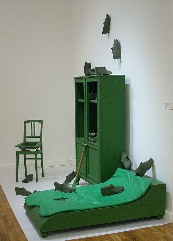 Prigov_ Дмитрий Александрович Пригов. Для бедной уборщицы. 1994. Инсталляция. Собственность семьи. Очень эффектная инсталляция с любимыми приговскими мотивами. А ведь подавляющее большинство задумок плодовитого и дисциплинированного художника так и осталось на бумаге. В кадре – «product placement» АХТАМАР (надпись на рюмке).