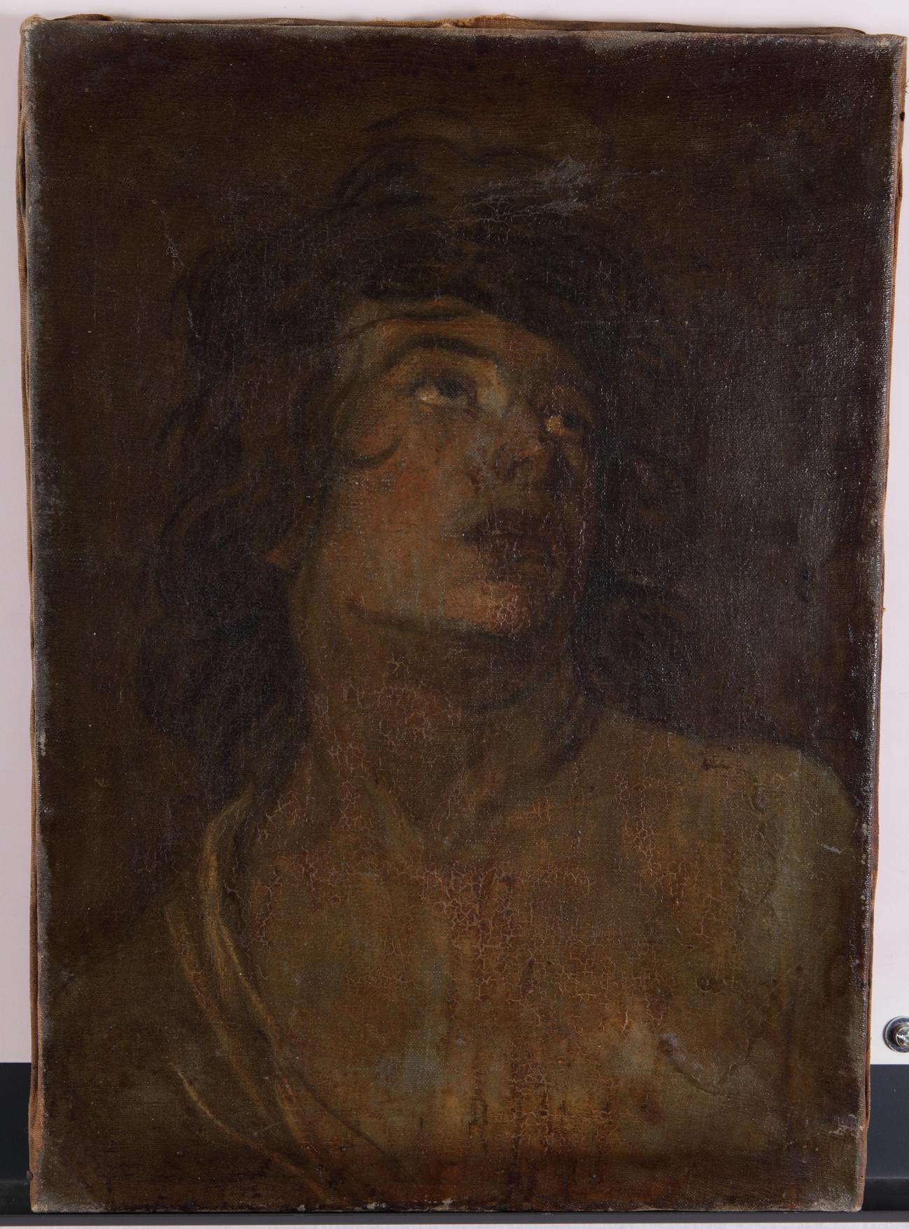 Работа относительно современная. За два столетия холст не обвис, не имеет изломов обветшаний вдоль загибов на подрамник и конечно вдоль внутренних ребер; даже по фотографиям видно, что картина не перетягивалась, была натянута на этот подрамник раз (смотрим по направлениям нитей холста относительно гвоздей). Грунт маслянный серый и пигмент прошел насквозь из-за плохой проклейки, т.е. нет среднего белого мелового слоя (художники два столетия назад относились серьезно к технологии). Подрамник современный, начала 20 века, и т.д. Картина написана профессионально ,но автор может быть кто угодно. На мой взгляд свободная копия. |