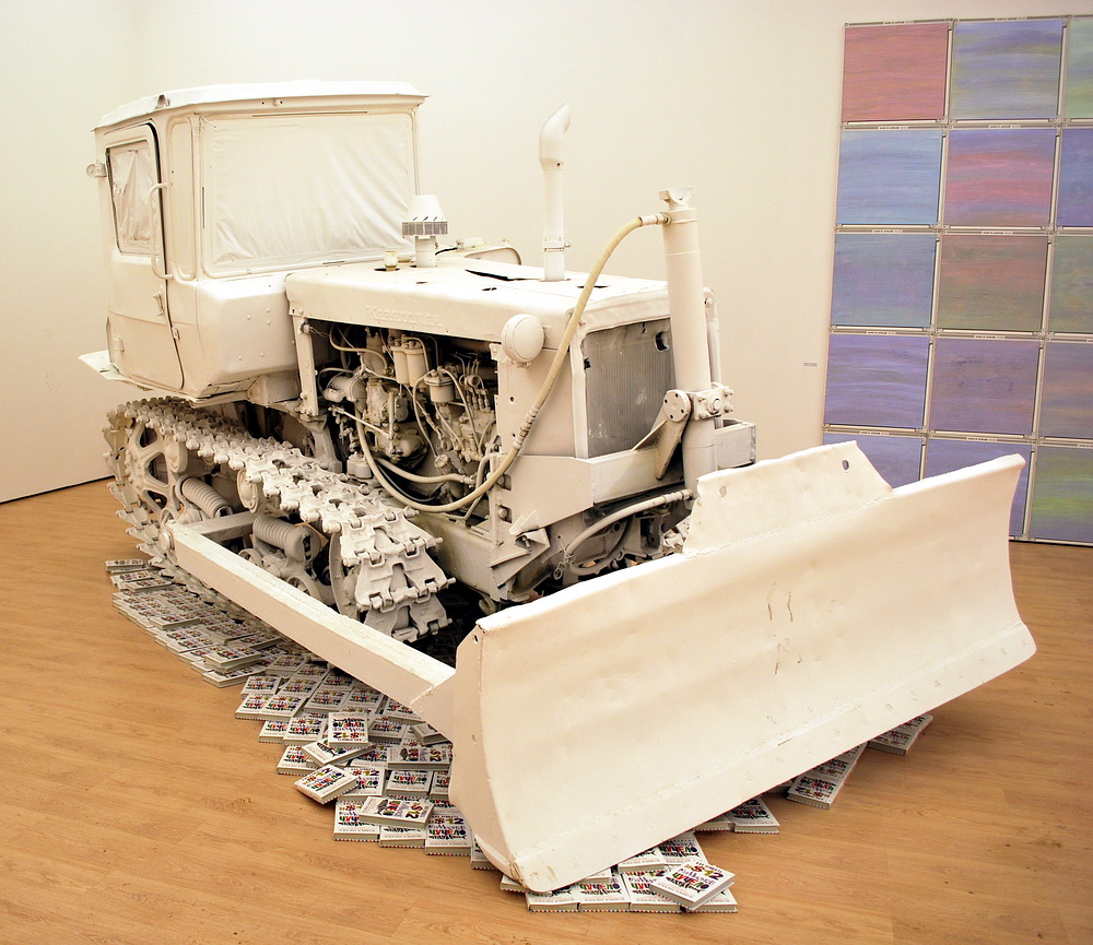 В чем впечатление? Штука Пузенкова называется "Как продать за 12 миллионов долларов бульдозер". Тут важно все. Стоит махина - бульдозер "Казахстан". Помещенная в музейное пространство и превратившаяся в произведение искусства. Это уже впечатление. Как перед танком. Причем это не грязное желтое чудовище, облитое соляркой, а белоснежный бульдозер-альбинос. Книги под ее гусеницами - критика порядков на рынке современного искусства. Критика через самую одиозную вещь - акулу "Физическая невозможность смерти в сознаннии живущего" Херста. Метафора могла быть и иная. Раньше на белый бульдозер проецировалась Мона Лиза (http://www.gif.ru/afisha/liza-vs-buldozer/). Меня удивили отсылы к бульдозерной выставке. Кажется натяжкой. Тем более, что в Беляево были по-моему не "казахстаны", а поливальные машины с ковшами. Вот репортаж с открытия галереи на facebook, про который я рассказывал http://www.facebook.com/pages/ArtArt...y/130874728436 |