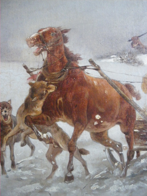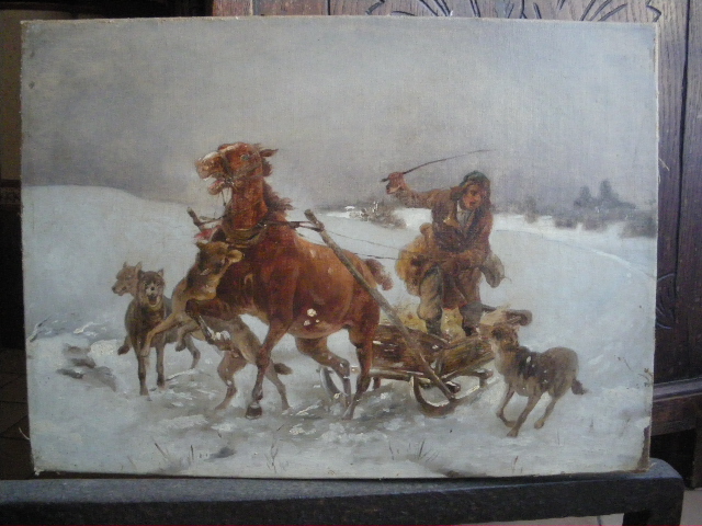 (я же...э-э-э... противница подобных сцен охоты, нападений и прочих агрессивных действий)). Есть такая картинка, подписи почему-то нет, но очень похоже на Шелоумова (акция сайта – замечательное дело)), но это во-первых. А во-вторых, когда вынула её из рамы, обнаружилось, что внешний холст вырезан и наклеен край в край на более старый холст, подрамник с французской печатью и старыми ржавыми гвоздями. Не записан, не перетянут, а именно наклеен. Загадка присутствует, согласитесь: холста/подрамника нет – художник пишет по старому холсту; холст есть/подрамника нет – художник перетягивает новый холст на старый подрамник… Что на нижнем холсте что-то есть/было – на то намекает ещё старая протекторная обклейка – значит висела картинка… Уж очень хочется посмотреть... (про рентген – особая песня) Можно ли как-то аккуратненько отклеить, а потом, если что, так же аккуратненько "вернуть на место" ? Что скажете?