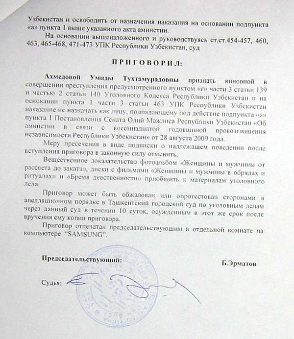 ------------------------------------------------------------------- Умида Ахмедова признана виновной по двум статьям, но амнистирована .10 февраля в Ташкенте вынесен приговор по делу узбекского фотографа и кинодокументалиста Умиды Ахмедовой, которая обвиняется в клевете и оскорблении узбекского народа. Суд признал ее виновной по обеим инкриминируемым ей статьям, но к фотографу будет применена амнистия, которая была объявлена в августе к 18-летию независимости Узбекистана. Подписка о невыезде отменена.Поводом для судебного разбирательства стал фотоальбом «Женщины и мужчины: от рассвета до заката», отражающий различные аспекты жизни людей в Узбекистане, а также документальный фильм «Бремя девственности», созданный Умидой Ахмедовой совместно с Олегом Карповым. Фотографии, вошедшие в этот альбом, доступны в Галерее «Ферганы.Ру», фильм «Бремя девственности» - здесь. И фильм, и книга были созданы на гранты Швейцарского посольства.