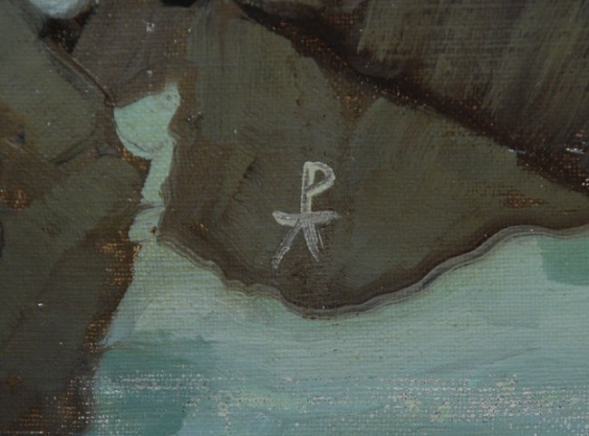 Я бы назвал эту картинку "Мишка на рыбалке" . А специалисты АРУСА называют её по-разному: "Харбор Уоллс" или "Букет Цветов"Lot 101 David Burliuk (1882 – 1967) “Harbor Walls, 1951” David Burliuk (1882 – 1967)“Bouquet of Flowers” Oil on Board 17” x 20”, frame 22” x 24 ½” Signed and inscribed “Harbor Walls, 1951” on the back Estimate $9,000 - $12,000