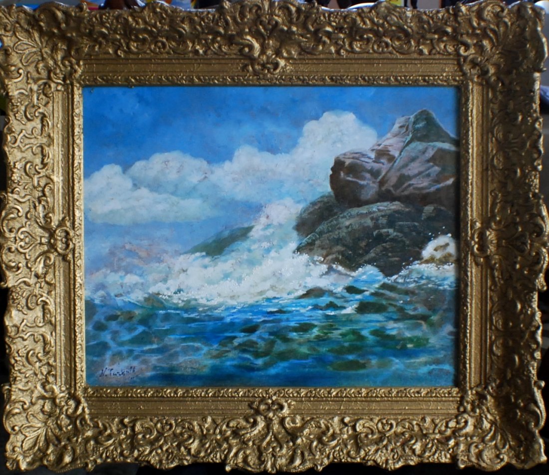 Lot 83 Nikolai Tarkhoff (1871 – 1930) “Seascape Oil on Board 15 3/” x 19 ¾”, heavy gilded frame 23 ½” x 27 ½”. Signed lower right, inscribed on the back. Estimate $2,500 - $3,500 |