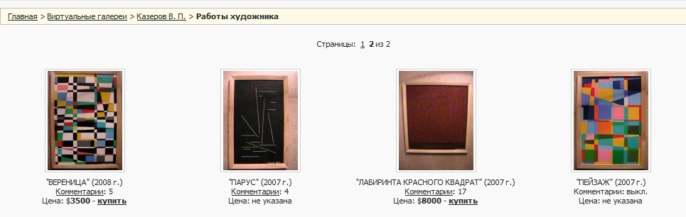 об компиляции : с таким подходом все художники только и делали что компилировали ну ту первую ( мою каракулину ) в пещере . об работах : если вы вставляете картинки , то и потрудитесь названия верные писать . об цене : какую цену поставил под работами , по такой готов продать эти работы . по ссылкам : http://www.artonline.ru/artist_gallery/kazerov http:// www.artlib.ru/index.php?id=11&fp=2&uid=8412 http://www.stihi.ru/avtor/kazerov по теме : раскручивая работу - раскручиваешь художника . |