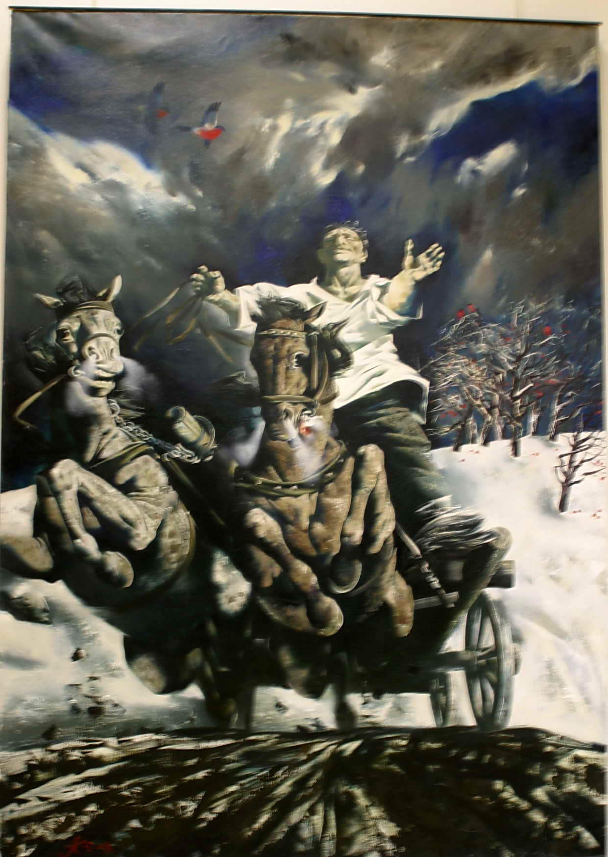 Со следующей картиной был странный эффект. Прохожу мимо вижу тёмную картину на которой ничего нельзя разобрать. Смотрю название и восхищаюсь. 2. Сизов Е.В. "Сражение Войска Речи посполитой с казаками на жёлтых водах" 2005 Ногинск. - осталось только само сражение описать. И почему автор выбрал именно это сражение? И главное ничего не видно. Решил сфотографировать и Вас повеселить. Сфоткал и поразился второй раз. На фото всё видно. Как в том артефакте из соседней ветки. 3. Астапенко "родина моя, полдень" 2008 Ростов-на-Дону 4. Псарёв В.П. "Художник и время" 2008 Дальше без названий  |