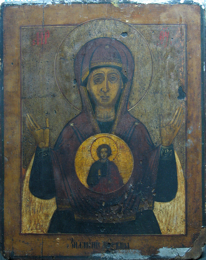 Then sold at Gelos. http://www.gelos.ru/month/jun2008/ikona.html Icon of Our Lady of the Sign. " Wood, gesso, gold leaf, tempera. 31H26, 5. Russian North, the end of XIX century. Preservation: without intervention, the loss of seating for up to a wooden framework on the background fields, and icons. Holes from the nails, to strengthen the salary. The paint layer on the personal and clothing in general in good condition. Monument thin elegant writing. (c) Care-9 500. |