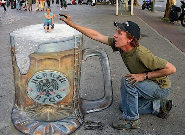 British street artist Julian Beaver and its know- how, bulk advertising street art on the pavement . Beaver is working with the chalk, so it works - just before the first rain . Despite the fragility of work orders at Beaver abound . In Moscow, painted in the 2005m on the order of one tobacco company .