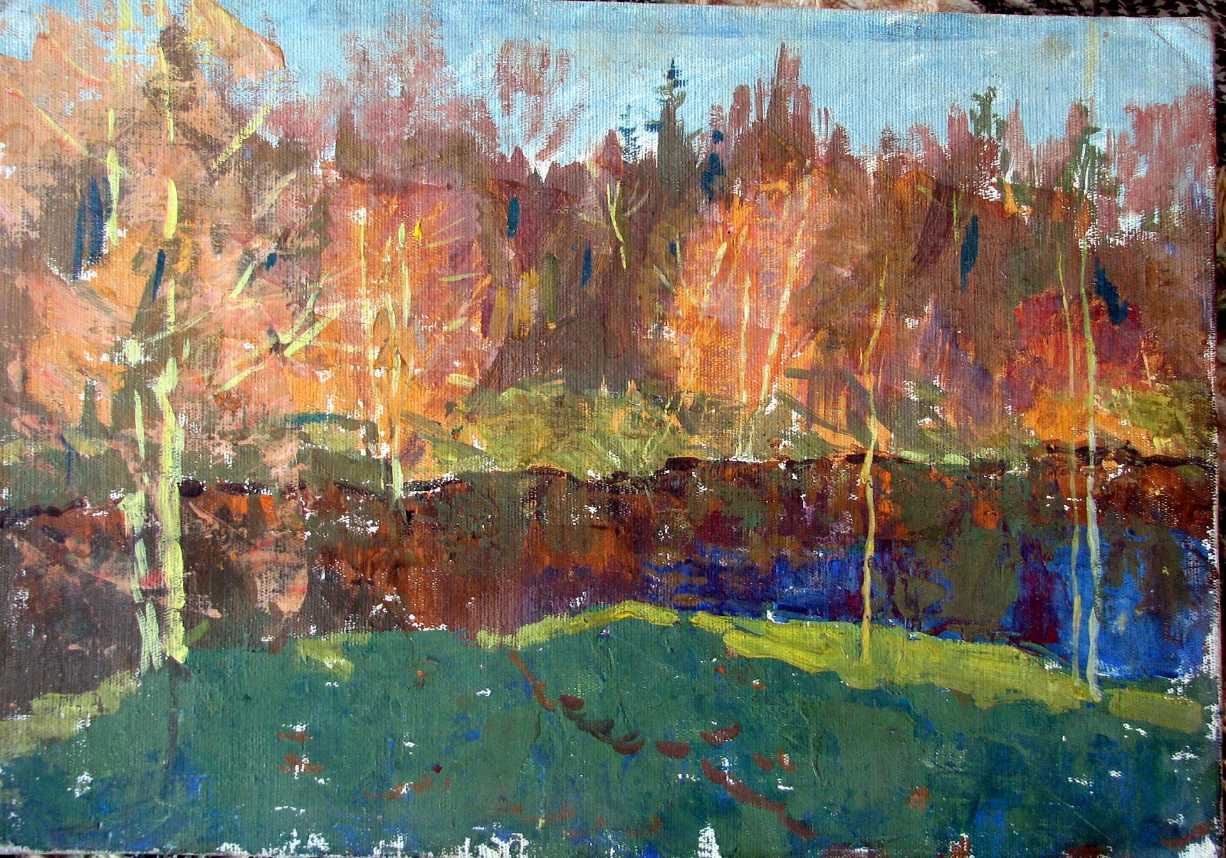 Вот что то похожее,во всяком случае напомнило. Академическая дача 1954г холст на картоне.