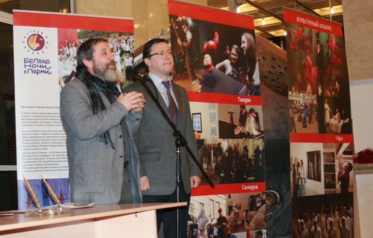 А перед открытием наш мэр Дмитрий Азаров и вице-премьер правительства Пермского края Борис Мильграм подписали договор о вступлении города Самары в проект "Культурный Альянс". |