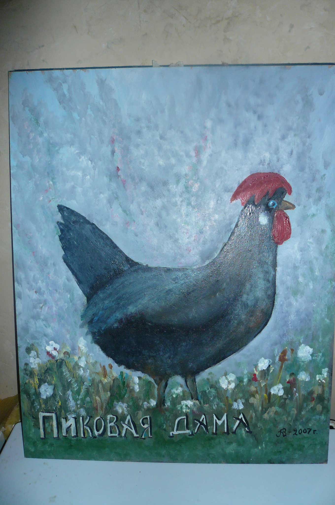 Was born in Ryazan region. During the war, helped his mother to knit scrim. Since then he started to get involved in knitting. All my life embroidering Romenian cross, burned out and painted on plywood and boards, wrote poetry, was very fond of ballet and knew by heart, "Eugene Onegin" is a little rusty. He writes on hardboard and canvas. began with gouache then pereshol in acrylic and oil. He believes that his painting was not serious, although his picture was exhibited at the snowman last Voest - Naive. " Everyone brings their work.  Subframes quote from the canvas, in Dereni from my father ostlos lot of canvas. he uses it. I forgot, 13let goats he kept them обажал necessary rastovanie with them was a whole tragediya.Kury, dog, koshki.A as he loves plants and all living things in general ... |