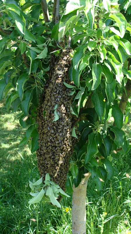 А дело было так : косил я газонокосилкой траву на участке...Вдруг,мне показалось,что косилка начала издавать гул самолета! Думаю,что за ерунда? Когда же посмотрел по сторонам,то увидел,что вокруг меня летают тысячи пчел!Я остановился и начал наблюдать,а сам потихоньку напеваю : Я тучка,тучка,тучка...я вовсе не медведь! Но вели себя они не агрессивно,по хозяйски ,взгромоздились на мою яблоньку,подломив ветку.Когда я приближался к ним с фотоаппаратом,начинали гудеть угрожающе и громче,но не нападали. Ну я и махнул рукой-пусть сидят! На следующий день,с восходом солнца они исчезли,оставив поломанной ветку....