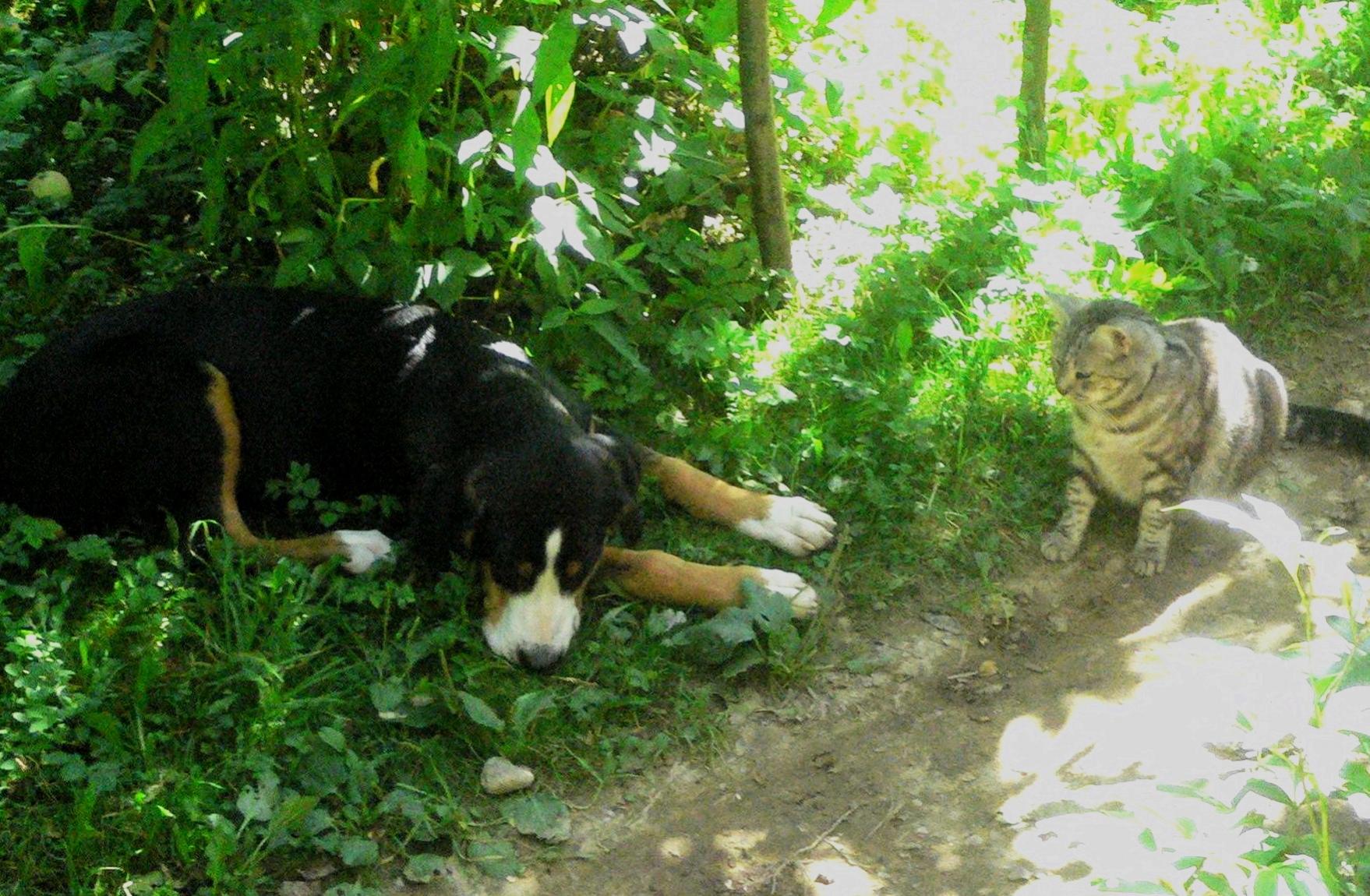 1. Мотя с Шармой частенько «на пару» охраняют вход в дом …. 2. Соседи тоже завели себе зенненхунд (только бернского), через пол года после того, как у нас появилась Шарма. Они похожи, но бернские более лохматые. Вик (Виконт) очень любит нашу Шарму. 3. Почему наша кошка так любит спать на спине!?…. 4. Мотя пришла успокоить обидевшуюся Шарму…. |
