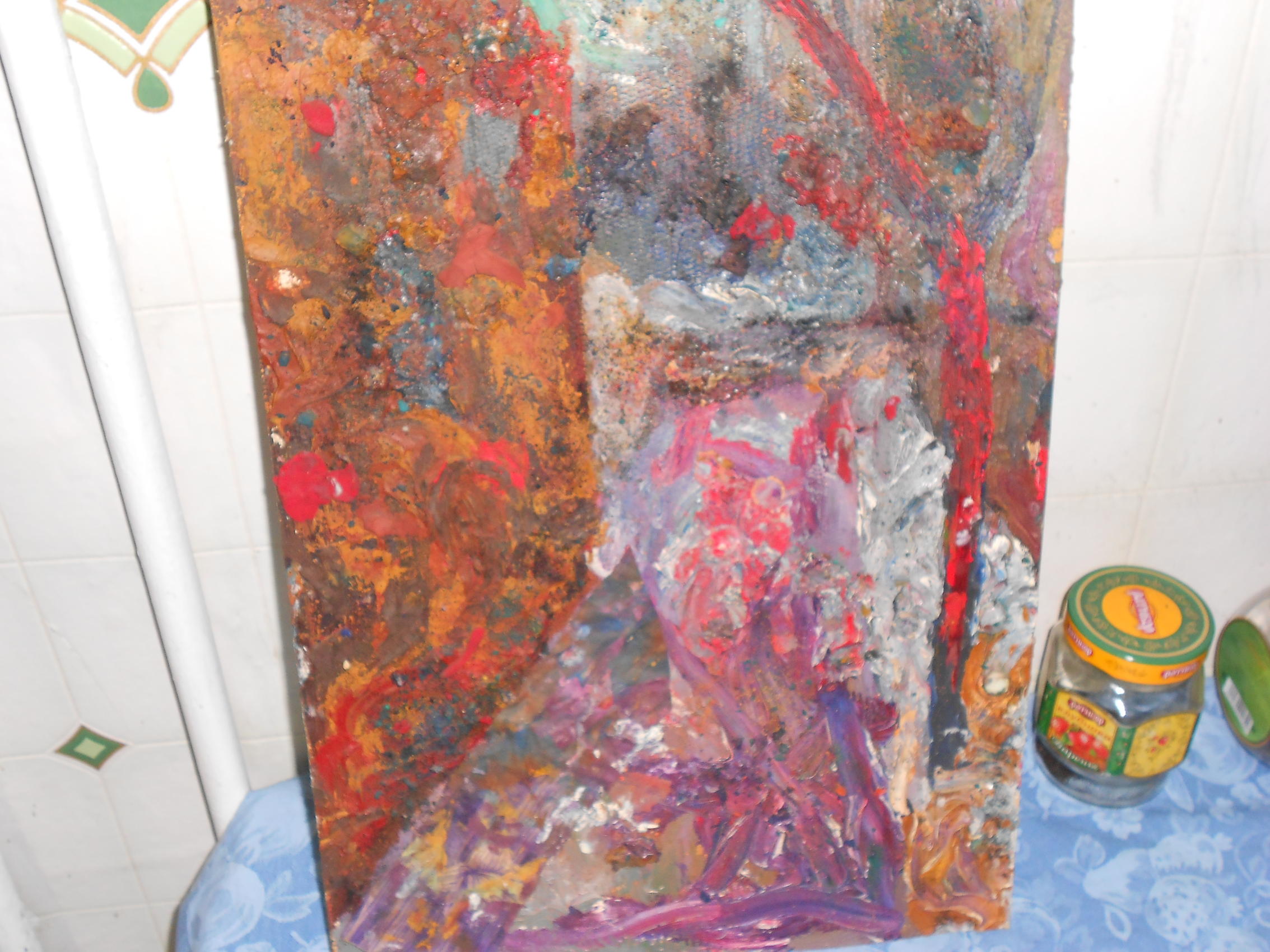 Живопись любительская. Цвет резкий (тюбиковый). Кистевая работа, кажется, неосмысленная. Слабая структурированность изображения. Много колористических повторов.