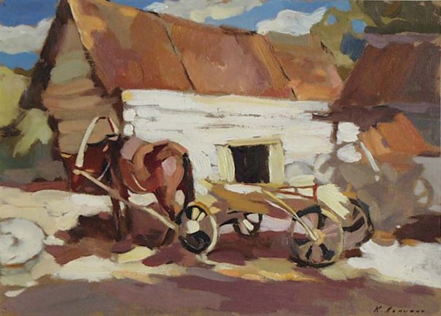 Как-то предложили мне "Ломыкина" где-то около 30 работ( все примерно 25*35), выбирай на любой вкус: о лошадки зимой, и "море" и даже русская деревня "Ломыкина" , вот самые "колоритные" из них: