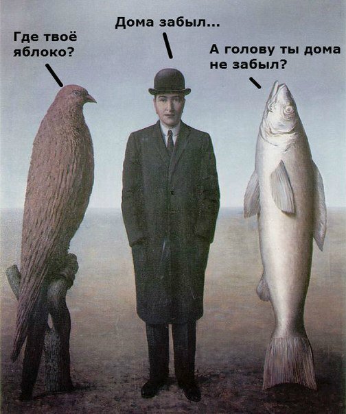 Картинка - René Magritte, Presence of Mind, 1960, oil on canvas, 116 x 89.5, Museum Ludwig, Cologne, а подпись какого-то остроумного чела.