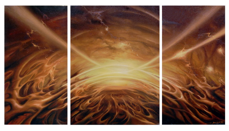 Fire, as the highest element, the most difficult to fit into human consciousness. Since man is attracted to a certain kinship to the earth, and in the spiritual world, he attracted a whirlwind, the exigencies of their actions. The space consists of these vibrations, always driven by a spiral vortex. Thus, every person creates a thin world. Most interestingly, were initially created the work presented here, and then obtained from various sources, explaining their significance. 1.Mir Fiery 50h70sm oil on canvas, 2003. 2.Zhizn after the death 60h80sm oil on canvas 1992. 3.Ognenny world 80h140sm triptych canvas 1992. 4.Dvizhenie-law of creation 60h80sm oil on canvas 1994. 5. In the labyrinth of time 60h80sm oil on canvas 1999. 6.Formy astral world 80h140sm triptych oil on canvas 1992. |