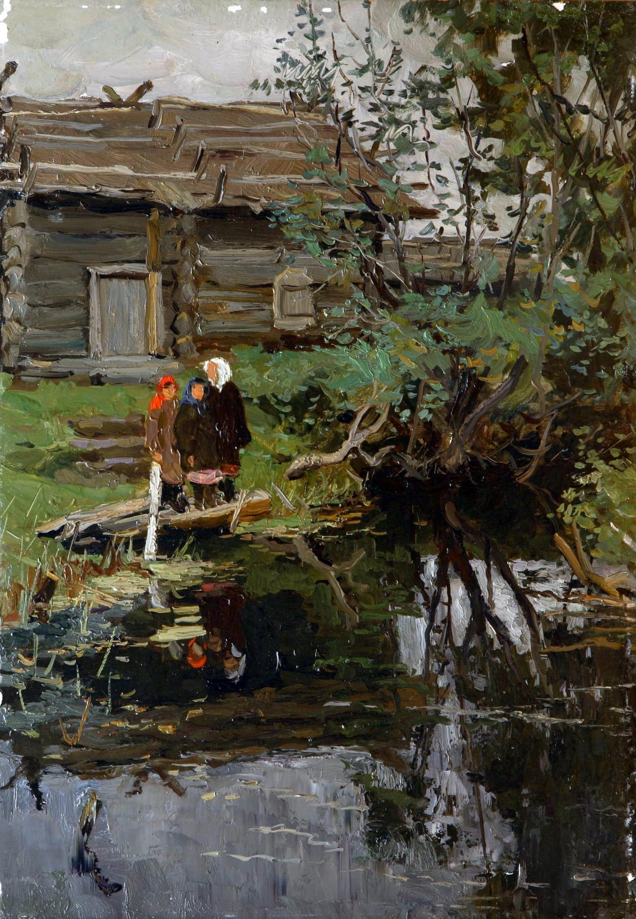 Как это выглядит и как это делается я вызнал, а на сколько это технически сложно воспроизвести... не знаю. Писать маслом многослойно это одно дело, а вот писать одним мазком многоцветно... другое. Выспрашивал у Дедули .... оказывается дело умения и техники. Выкладываю два фрагмента работ, которые в моих глазах и показывают чудо-мазки и чудесные сплавы красок. На первом фрагменте хорошо видна типичная техника прорисовки деревянного сруба. Второй фрагмент, это прорисовка луча света на деревянный пол, в тёмном помещении, где на полу разлита мыльная вода. Посмотрев на этот "кишмиш", заметив при этом, что по цвету, тонам и общему колориту всё в точку, получаешь ответ на вопрос, почему Стожарова подделать практически невозможно. |