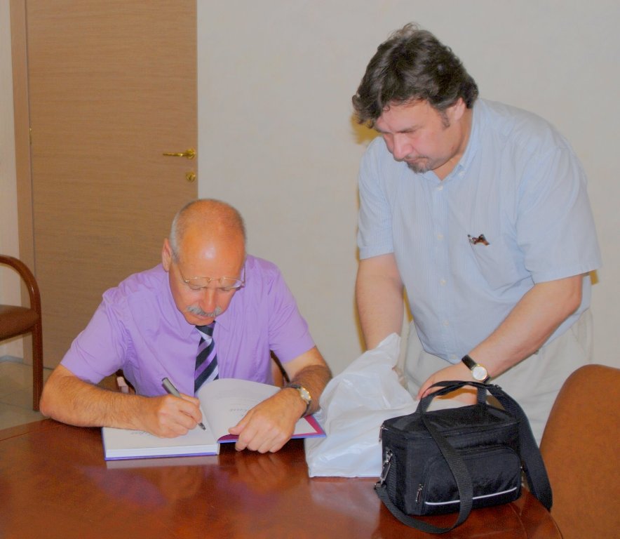 1. Обсуждение книги. Генеральный директор ИФЗ Т. А. Тылевич и автор монографии М. П. Тубли. На остальных фотографиях 2-8: автор подписывает книги, а "бойцы подносят снаряды".